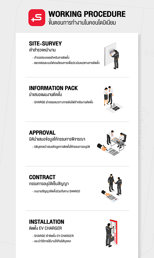สำหรับแคมเปญ “SHARGE ปลดล็อค” เปิดให้ผู้พัฒนาโครงการ ซึ่งมีแผนพัฒนาคอนโดมิเนียมโครงการใหม่ บริษัทบริหารอาคาร และเจ้าของร่วม ซึ่งบริหารและอาศัยในโครงการคอนโดมิเนียมที่สร้างเสร็จแล้ว ติดต่อประสานงานเข้ามาทาง Call Center ของ SHARGE ที่เบอร์ 0-2114-7571 หรือทางอีเมล evstation@shargemgmt.com โดยจะมีเจ้าหน้าที่ประสานงานเพื่อเข้าไปดูสถานที่หน้างาน ประเมินความต้องการ และนำเสนอแผนการติดตั้งให้ต่อไป ทั้งนี้ บริการติดตั้งในคอนโดมิเนียมของบริษัท จะเป็นบริการแบบครบวงจร One-Stop Service ตั้งแต่การประสานกับหน่วยงานด้านการไฟฟ้าที่รับผิดชอบพื้นที่ ไปจนถึงการติดตั้ง และการบริการหลังการขาย