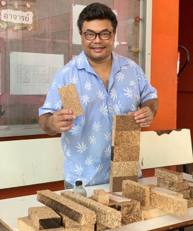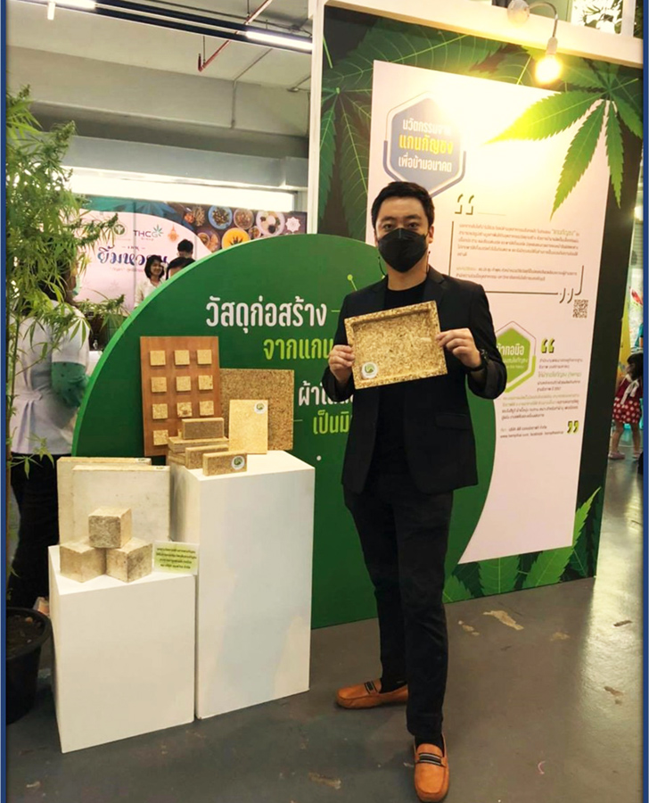 ดร.ประชุม คำพุฒ หัวหน้าหน่วยวิจัยวัสดุที่เป็นมิตรต่อสิ่งแวดล้อม มทร.ธัญบุรี กล่าวว่า จากการที่รัฐบาลได้ส่งเสริมให้มีการปลูกกัญชงเพื่อเป็นสินค้าทั้งเครื่องสำอาง สิ่งทอ และยารักษาโรค ทำให้ปัจจุบันกัญชงได้รับความนิยมมากขึ้นอย่างรวดเร็ว โดยมีพื้นที่เพาะปลูกขยายจากเดิมจำนวนมาก โดยกัญชงสามารถปลูกได้ทั่วประเทศ ทั้งสายพันธุ์ที่สกัดสารและสายพันธุ์ที่ทำการลอกเปลือกไปแปรรูปทอเป็นเส้นด้ายในอุตสาหกรรมสิ่งทอ การลอกเปลือกกัญชงออก ทำให้เหลือแกนกัญชงหรือ “แกนเฮมพ์” (Hemp Stalk) ในแปลงปลูกเป็นจำนวนมากที่ต้องกำจัดทิ้ง ทางผู้ประกอบการและชุมชน จึงต้องการทำเป็น Zero Waste ด้วยการเพิ่มมูลค่าจากแกนกัญชงเหลือทิ้ง