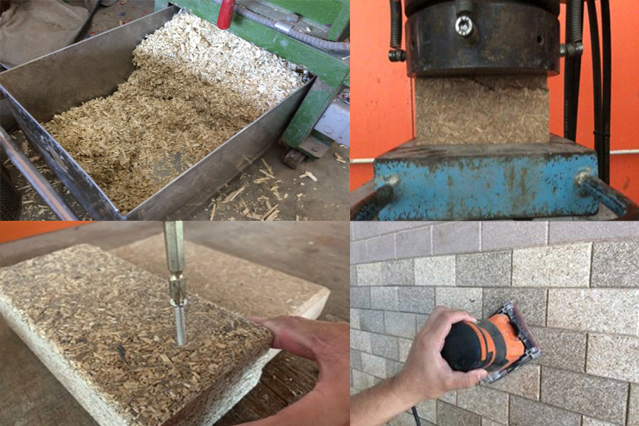 สำหรับกระบวนการผลิตวัสดุก่อผนังฉนวนความร้อนจากแกนกัญชงอัดน้ำยางธรรมชาตินั้น มีขั้นตอนวิธีผลิตโดยทำการบดย่อยแกนกัญชงให้มีขนาดต่าง ๆ ตามต้องการ และนำไปขึ้นรูปเป็นก้อนอิฐไม้เทียมด้วยวิธีการอัดขึ้นรูปด้วยความร้อนโดยใช้สารเชื่อมประสานที่เป็นน้ำยางธรรมชาติที่ผ่านกระบวนการเสริมความแข็งแรงให้กับน้ำยาง กำหนดค่าอุณหภูมิความร้อน แรงอัด ปริมาณวัสดุ และระยะเวลาที่ใช้ในการอัดขึ้นรูป ทำการอัดขึ้นรูปเป็นแผ่นอัดขนาดใหญ่ให้มีความหนา 4 ซม. แล้วทำการตัดแต่งให้มีขนาดเท่ากับอิฐก่อสร้างสามัญ สามารถทำเดือยในลักษณะเลโก้เพื่อก่อซ้อนเป็นชั้น ๆ ได้