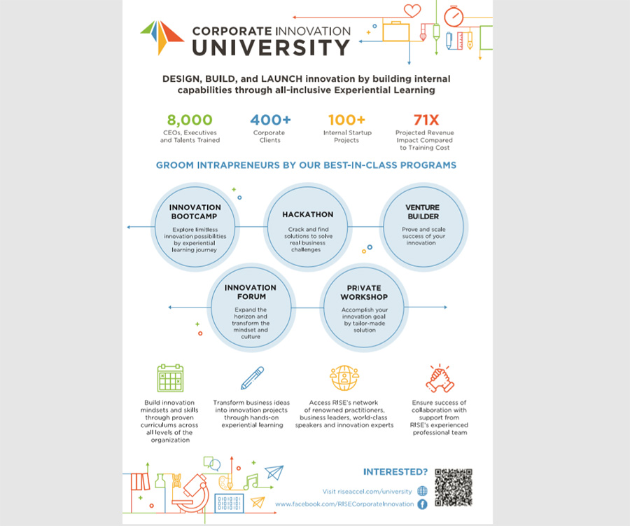 สำหรับแนวทางที่สอง Inside-out Approach คือเร่งพัฒนาภายในองค์กร ด้วยการออกแบบและสร้างนวัตกรรมผ่านการรีสกิลผู้บริหารและพนักงานให้มีความรู้ ความเข้าใจ จนไปสู่การลงมือทำ มุ่งปั้น ‘Intrapreneur’ หรือผู้ประกอบการภายในองค์กร ผ่านการเรียนรู้ในรูปแบบการปฏิบัติงานจริง โดยในปี 2564 นี้ RISE University ได้ออกแบบ Corporate Innovation Certification Program โปรแกรมรับรองความสามารถด้านนวัตกรรมองค์กร เพื่อตอบสนองความต้องการองค์กรในการพัฒนาทักษะของบุคลากรในด้านนวัตกรรมอย่างเป็นระบบ โดยมี 5 ทักษะสำคัญเป็นแก่นในการออกแบบการเรียนการสอน ได้แก่ 1. การสร้างและพัฒนานวัตกรรม 2. การออกแบบธุรกิจ 3. การนำเทคโนโลยีมาใช้ให้เกิดประโยชน์ 4. การเป็นผู้นำการเปลี่ยนแปลง 5. การสื่อสารที่มีประสิทธิภาพ และเพื่อต่อยอดทักษะและไอเดียในการสร้างนวัตกรรม RISE ได้พัฒนา Venture Building Program ให้คนในองค์กรสามารถนำไอเดียมาพัฒนาเพื่อให้เกิดเป็นนวัตกรรมที่ใช้ได้จริงและเกิดผลลัพธ์ทางธุรกิจ