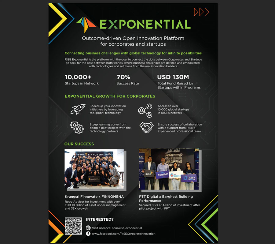 โดยแนวทางแรก Outside-in Approach คือ การพัฒนาจากภายนอกสู่ภายใน เนื่องมาจากความต้องการของผู้บริโภคปัจจุบันที่เปลี่ยนแปลงไปอย่างรวดเร็ว องค์กรต้องสามารถปรับตัวและพัฒนานวัตกรรมเพื่อตอบโจทย์ความต้องการให้ทันท่วงที “RISE Exponential” แพลตฟอร์มการสร้างนวัตกรรมแบบเปิดที่เน้นผลลัพธ์เป็นที่ตั้ง (Outcome-driven Open Innovation Platform) ช่วยสร้างความเป็นไปได้ที่ไม่มีจุดสิ้นสุด และเร่งสปีดการสร้างนวัตกรรมให้เร็วขึ้นแบบก้าวกระโดด ด้วยการนำเทคโนโลยีและโซลูชันของผู้สร้างนวัตกรรมตัวจริงจากเครือข่ายสตาร์ทอัพกว่า 10,000 รายทั่วโลกมาจับคู่กับองค์กร เพื่อแก้ปัญหาหรือความท้าทายทางธุรกิจ ผ่านการทำโครงการนำร่อง (Proof of Concept และ Pilot Project) ควบคู่กับการสนับสนุนจากทีมงานที่มีประสบการณ์ในการสร้างนวัตกรรมองค์กรจาก RISE เพิ่มโอกาสในการสร้างนวัตกรรมองค์กรสู่ความสำเร็จเพิ่มขึ้นถึง 70%