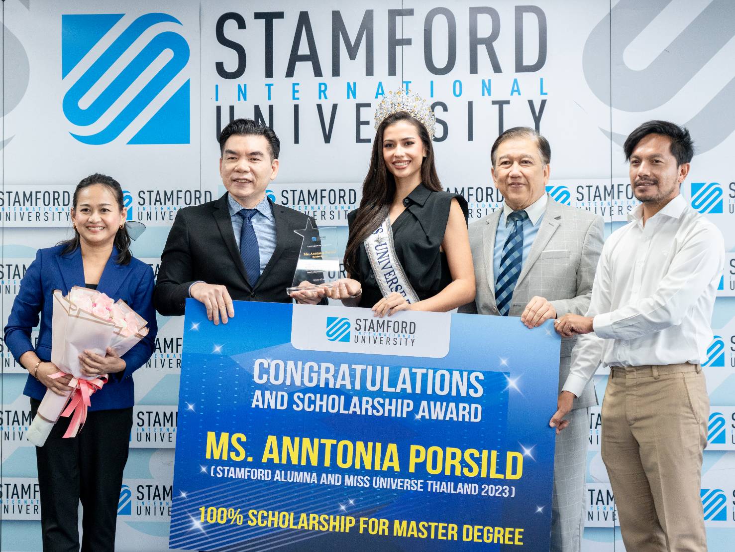 เมื่อวันที่ 3 ตุลาคม 2566 ที่มหาวิทยาลัยนานาชาติแสตมฟอร์ด วิทยาเขตพระรามเก้า กรุงเทพ ฯ “ ดร. อภิเทพ แซ่โค้ว” รักษาการอธิการบดี มหาวิทยาลัยนานาชาติแสตมฟอร์ด มอบทุนการศึกษาระดับปริญญาโท ให้กับ “ Ms. Anntonia Porsild” หรือ แอน- แอนโทเนีย โพซิ้ว Miss Universe Thailand 2023 (MUT2023) โดยมีผู้บริหารกองประกวดฯ ผู้บริหารมหาวิทยาลัยฯ รวมถึงนักศึกษาไทย-ต่างชาติ และพี่ ๆ ศิษย์เก่า เข้าร่วมงานเพื่อแสดงความยินดี และเป็นกำลังใจเพื่อเข้าร่วมประกวดในเวทีระดับโลก Miss Universe 2023 ที่กำลังจะมาถึงในเดือนพฤศจิกายน 2566 นี้