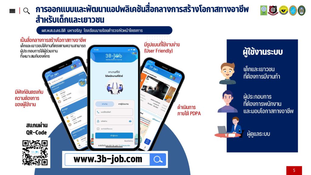 ผศ.พ.ต.อ.ดร. ธิติ มหาเจริญ รองคณบดีคณะนิติวิทยาศาสตร์ โรงเรียนนายร้อยตำรวจ กล่าวว่า โครงการออกแบบพัฒนาแอพพลิเคชัน “3B-JOB” เป็นโครงการวิจัยที่ได้รับการสนับสนุนจาก วช. ซึ่งมุ่งเน้นการสร้างโอกาสทางอาชีพสำหรับเด็กและเยาวชนที่เคยก้าวพลาด ด้วยการใช้แอพพลิเคชันเป็นสื่อกลางระหว่างผู้ประกอบการ นายจ้าง และเด็ก เยาวชนที่ต้องการมีงานทำ โดยแบ่งผู้ใช้งานออกเป็น 2 กลุ่ม ได้แก่ 1) กลุ่มเครือข่ายส่งเสริมอาชีพ คือ กลุ่มผู้ประกอบการหรือนายจ้างที่สามารถประชาสัมพันธ์ภารกิจของหน่วยงานลงประกาศรับสมัครงาน และเสนอตำแหน่งงานที่เหมาะสมให้กับเด็กและเยาวชนได้โดยตรง และ 2) กลุ่มเด็กและเยาวชนที่ต้องการมีงานทำ ซึ่งสามารถสร้างโปรไฟล์ ลงประวัติส่วนตัว และนำเสนอศักยภาพและทักษะในด้านต่าง ๆ ที่ตรงตามความต้องการของตนเองและตลาดแรงงาน