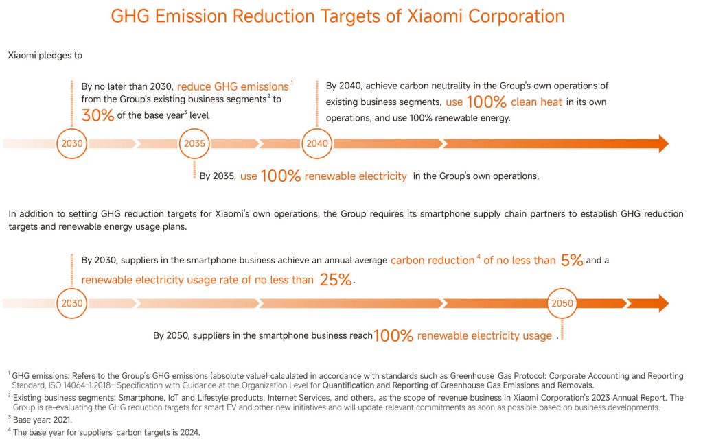 นอกจากการกำหนดเป้าหมายในการลดก๊าซเรือนกระจก (GHG) ในการดำเนินงานของเสียวหมี่เองแล้ว เสียวหมี่ยังได้กำหนดให้พันธมิตรในห่วงโซ่อุปทานของสมาร์ทโฟนให้กำหนดเป้าหมายการลดก๊าซเรือนกระจก (GHG) และแผนการใช้พลังงานหมุนเวียนอีกด้วย ภายในปี 2573 ซัพพลายเออร์ในธุรกิจสมาร์ทโฟนจะต้องลดการปล่อยคาร์บอนเฉลี่ยต่อปีไม่น้อยกว่า 5 เปอร์เซ็นต์ (โดยใช้ปี 2567 เป็นปีฐาน) และอัตราการใช้ไฟฟ้าหมุนเวียนไม่น้อยกว่า 25 เปอร์เซ็นต์ และภายในปี 2593 ซัพพลายเออร์ของธุรกิจสมาร์ทโฟนของเสียวหมี่จะต้องใช้พลังงานหมุนเวียนให้ได้ 100 เปอร์เซ็นต์