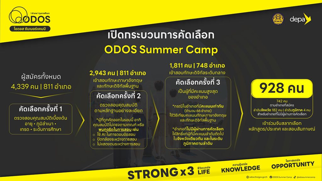 ผศ.ดร.ณัฐพล นิมมานพัชรินทร์ ผู้อำนวยการใหญ่ สำนักงานส่งเสริมเศรษฐกิจดิจิทัล หรือ ดีป้า เปิดเผยว่า ตามที่คณะรัฐมนตรีได้มอบหมายให้ กระทรวงดิจิทัลเพื่อเศรษฐกิจและสังคม โดยดีป้าเป็นหน่วยงานหลักในการดำเนินโครงการ ODOS Summer Camp ค่ายแห่งโอกาสภาคฤดูร้อน ทุนการศึกษาแบบให้เปล่า จำนวน 928 ทุน ซึ่งมีวัตถุประสงค์เพื่อเปิดโอกาสให้เยาวชนไทยได้มีประสบการณ์การใช้ชีวิตและการศึกษา