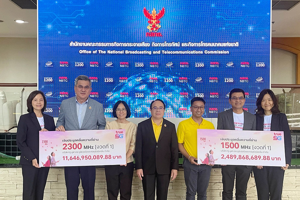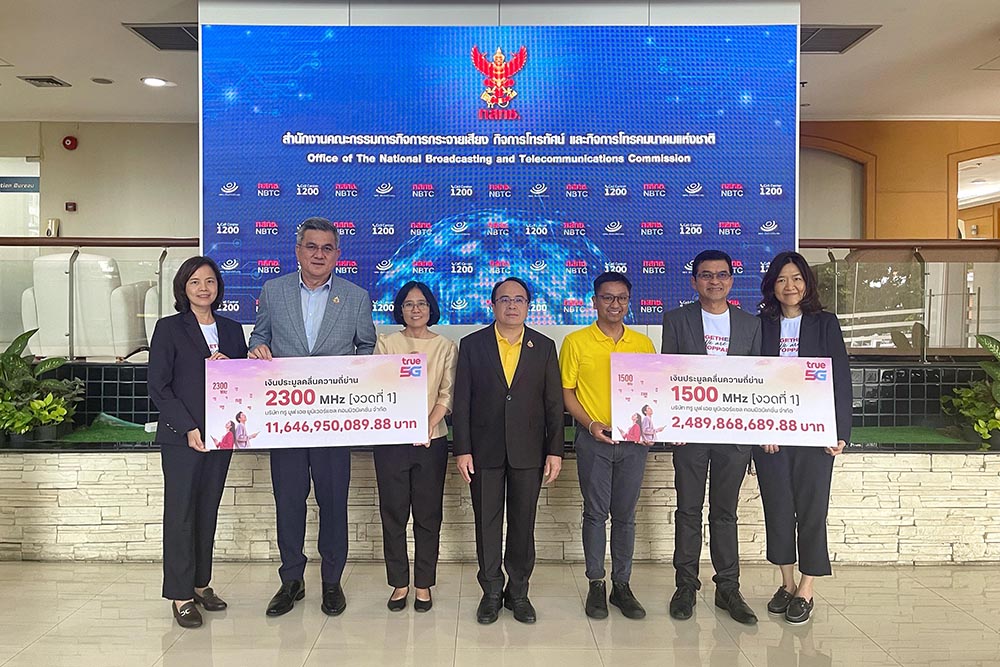 “ทรู มูฟ เอช ยูนิเวอร์แซล คอมมิวนิเคชั่น” ชำระค่าคลื่นความถี่ย่าน 2300 MHz งวดที่ 1 จำนวน 11,646,950,089.88 บาท (รวมภาษีมูลค่าเพิ่ม) และชำระค่าคลื่นความถี่ย่าน 1500 MHz งวดที่ 1 จำนวน 2,489,868,689.88 บาท (รวมภาษีมูลค่าเพิ่ม) พร้อมนำส่งหนังสือค้ำประกันการชำระเงินประมูลคลื่นความถี่งวดที่เหลือแก่ สำนักงาน กสทช. ตามเงื่อนไขการดำเนินการก่อนรับใบอนุญาตครอบคลุมระยะเวลาการอนุญาต 15 ปี นับตั้งแต่วันที่ 4 สิงหาคม 2568 โดยมีนายจักรกฤษณ์ อุไรรัตน์ (ที่ 2 จากซ้าย) หัวหน้าคณะผู้บริหารด้านกิจการองค์กร พร้อมด้วย นายนฤพนธ์ รัตนสมาหาร (ที่ 6 จากซ้าย) หัวหน้าสายงานรัฐกิจสัมพันธ์และกำกับดูแล และนางสาวกนกพร คุณชัยเจริญกุล (ซ้ายสุด) หัวหน้าสายงานกลยุทธ์กฎระเบียบการกำกับดูแลกิจการ และ นางสาววีณา จ่างเจริญ (ขวาสุด) ผู้เชี่ยวชาญสายงานกลยุทธ์กฎระเบียบการกำกับดูแลกิจการ บริษัท ทรู คอร์ปอเรชั่น จำกัด (มหาชน) เป็นผู้แทนบริษัทฯ ในการชำระค่าคลื่นความถี่ โดยมีนายสุทธิศักดิ์ ตันตะโยธิน (กลาง) รองเลขาธิการ กสทช.สายงานกิจการโทรคมนาคม พร้อมด้วยนางพุธชาด แมนมนตรี (ที่ 3 จากซ้าย) ผู้อำนวยการสำนัก สำนักการอนุญาตประกอบกิจการโทรคมนาคม 1 (ปท.1) และนายประถมพงศ์ ศรีนวล (ที่ 5 จากซ้าย) ผู้อำนวยการสำนักวิชาการและการจัดการทรัพยากรโทรคมนาคม สำนักงาน กสทช. ร่วมรับมอบ ณ สำนักงาน กสทช.