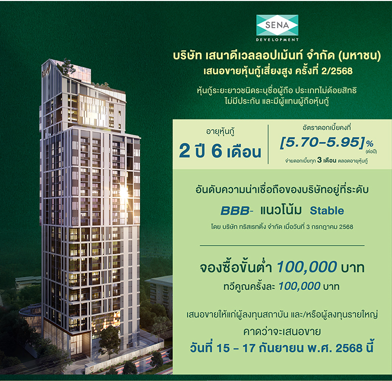 ทั้งนี้ บริษัทได้รับการจัดอันดับความน่าเชื่อถือของผู้ออกหุ้นกู้ที่ระดับ “BBB-” ด้วยแนวโน้มอันดับเครดิต “Stable” หรือ “คงที่” จากบริษัท ทริสเรทติ้ง จำกัด เมื่อวันที่ 3 กรกฎาคม พ.ศ. 2568 สำหรับผู้ลงทุนที่สนใจจองซื้อหุ้นกู้ สอบถามข้อมูลเพิ่มเติมได้ที่ SENA Call Center โทร 1775 ต่อ 100 และที่เว็บไซด์ https://campaign.sena.co.th/senabond หรือติดต่อผ่านสถาบันการเงินทั้ง 16 แห่ง
