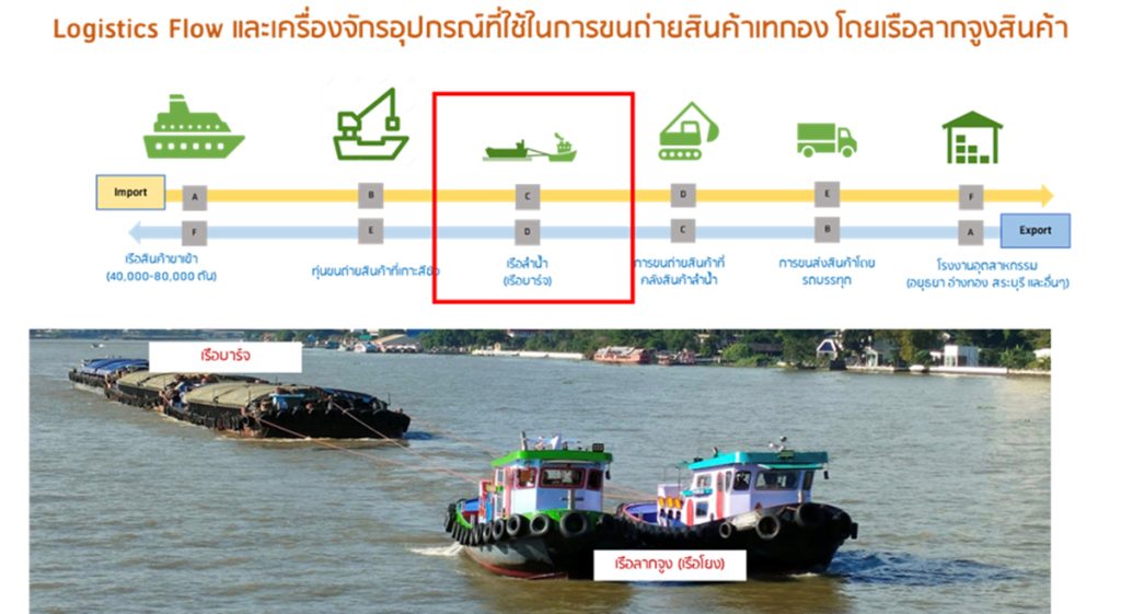 ด้วยต้นทุนที่สูงขึ้นมาจากปัจจัยต่าง ๆ ที่ใช้ในกระบวนการลำเลียงสินค้าเทกอง ที่เริ่มจากการนำเข้าสินค้าทางเรือทะเลที่มีขนาดการบรรทุกระหว่าง 40,000–80,000 ตัน โดยจอดเทียบทุ่นกลางทะเลที่เกาะสีชัง จากนั้นทำการขนถ่ายสินค้าลงเรือบาร์จ (Barge) ขนาด 1,000–3,500 ตัน โดยใช้เครนลอยน้ำ (Floating crane) แล้วจึงลากจูงเรือบาร์จเข้าสู่แม่น้ำเจ้าพระยาและแม่น้ำป่าสักด้วยเรือลากจูง (Tugboat) เพื่อนำสินค้าไปยังท่าเรือหรือคลังสินค้าในพื้นที่อำเภอนครหลวง จังหวัดพระนครศรีอยุธยา หรือจุดหมายอื่น ๆ ที่กำหนด กระบวนการนี้จะมีการประสานงานกับภาคพื้นดินเพื่อให้รถบรรทุกเข้ารับช่วงการขนถ่ายสินค้าได้อย่างต่อเนื่อง