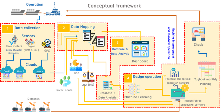 ศ.ดร.กาญจนา เศรษฐนันท์ อาจารย์ประจำคณะวิศวกรรมศาสตร์ มหาวิทยาลัยขอนแก่น หัวหน้าคณะทีมวิจัย กล่าวถึงโครงการนี้ว่า เป็นการประยุกต์ใช้เทคโนโลยีดิจิทัลเพื่อพัฒนาระบบลำเลียงสินค้าเทกองทางน้ำอย่างเป็นระบบและทันสมัย ครอบคลุมการพัฒนาระบบตรวจวัดอัตราการใช้พลังงานของเรือลากจูงแบบเรียลไทม์ การพัฒนาแบบจำลองการเรียนรู้ของเครื่อง (Machine Learning) เพื่อกำหนดเงื่อนไขการเดินเรือที่เหมาะสม และใช้ข้อมูลเพื่อปรับปรุงระบบ Hardware ของเรือลากจูงให้มีประสิทธิภาพสูงขึ้น การพัฒนาซอฟต์แวร์วางแผนการลำเลียงแบบหลายคาบเวลา เพื่อสนับสนุนการลำเลียงสินค้าเทกองที่ทำให้ต้นทุนการลำเลียงสินค้ามีค่าลดลงอย่างน้อย 5% ตลอดจนการจัดทำฐานข้อมูลขนาดใหญ่ (Big Data) และระบบติดตามผลผ่าน Dashboard บน Mobile Platform เพื่อช่วยให้ผู้ประกอบการสามารถวางแผนและปรับกลยุทธ์ได้อย่างทันท่วงทีและมีประสิทธิภาพสูงสุด
