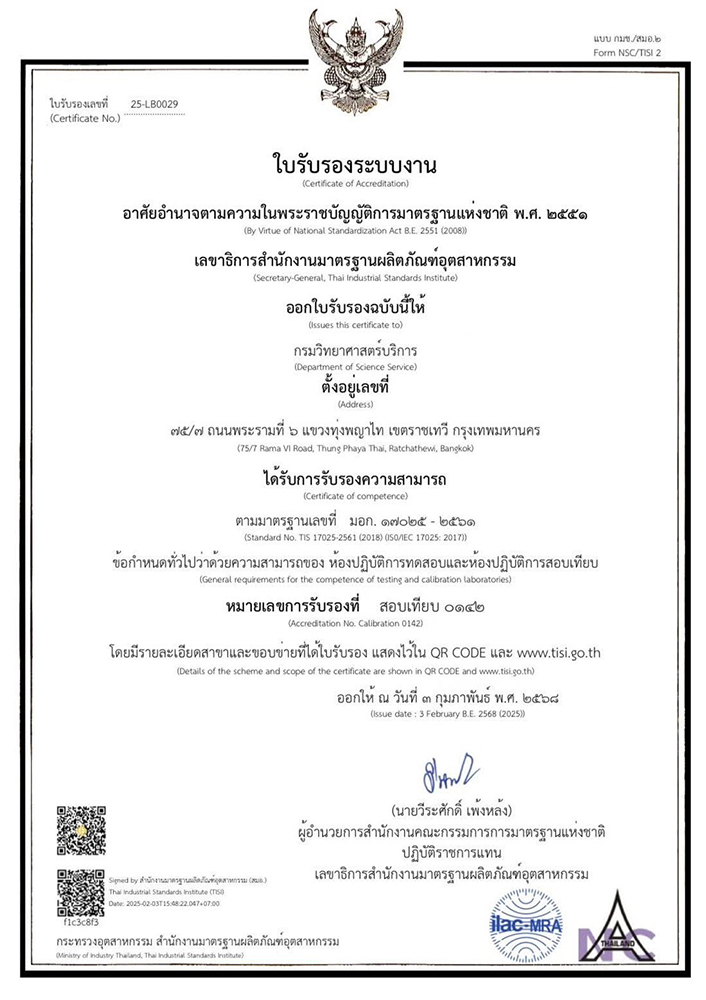 ห้องปฏิบัติการสอบเทียบ กรมวิทยาศาสตร์บริการ กระทรวงการอุดมศึกษา วิทยาศาสตร์ วิจัยและนวัตกรรม(อว.) ได้รับการรับรองความสามารถห้องปฏิบัติการตามมาตรฐาน ISO/IEC 17025:2017 จากสำนักงานมาตรฐานผลิตภัณฑ์อุตสาหกรรม (สมอ.) เมื่อวันที่ 19 มิถุนายน 2568 โดยมีหมายเลขการรับรอง สอบเทียบ 0142 ครอบคลุมทั้งห้องปฏิบัติการสอบเทียบถาวรและห้องปฏิบัติการสอบเทียบนอกสถานที่ รวมทั้งสิ้น 61 ขอบข่าย ใน 8 สาขาการสอบเทียบ ได้แก่ มิติ มวล ปริมาตร สั่นสะเทือน อุณหภูมิ ความชื้น เครื่องมือแพทย์ และแรง