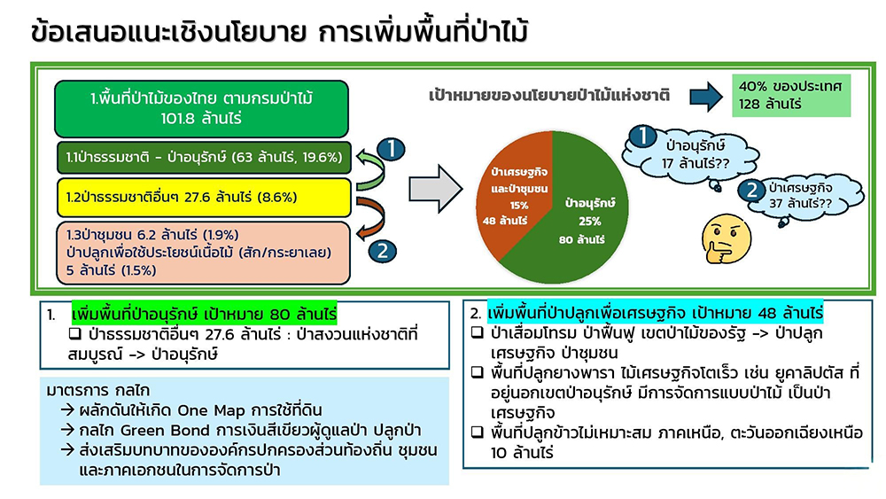 ดร.ยุวนันท์ สันติทวีฤกษ์ นักวิจัยนโยบายอาวุโส ไบโอเทค และหัวหน้าโครงการฯ เปิดเผยว่า การดำเนินงานภายใต้โครงการนี้ ได้จัดทำบัญชี 4 เรื่อง ได้แก่ บัญชีพื้นที่ป่าไม้ บัญชีทรัพยากรไม้ บัญชีระบบนิเวศป่าไม้ (พื้นที่นำร่อง: อุทยานแห่งชาติเขาใหญ่) และบัญชีระบบนิเวศพื้นที่สีเขียว (พื้นที่นำร่อง: คุ้งบางกะเจ้า) ซึ่งบัญชีเหล่านี้ช่วยติดตามและประเมินการเปลี่ยนแปลงของทรัพยากร ทั้งส่วนที่คงอยู่และส่วนที่ถูกใช้ประโยชน์ ตัวอย่างเช่น ข้อมูลชี้ว่า แนวโน้มพื้นที่ป่าไม้ของไทยลดลงต่อเนื่อง แต่หากมีนโยบายสนับสนุนการปลูกและใช้ไม้เศรษฐกิจควบคู่กับการพัฒนาเศรษฐกิจคาร์บอนต่ำอย่างจริงจัง เช่น สัก ยางพารา ยูคาลิปตัส จะช่วยเพิ่มพื้นที่ป่าไม้ให้บรรลุเป้าหมาย ร้อยละ 40 ของพื้นที่ประเทศ ลดการนำเข้าไม้และเยื่อจากต่างประเทศ และสร้างมูลค่าในอุตสาหกรรมที่เกี่ยวข้องกว่า 450,000 ล้านบาทต่อปี