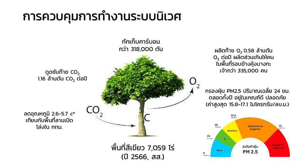 ในเชิงนิเวศพบว่า ระบบนิเวศป่าไม้สามารถกักเก็บคาร์บอน 58 ล้านตัน CO₂e (Carbon Dioxide Equivalent หรือคาร์บอนไดออกไซด์เทียบเท่า) เป็นแหล่งต้นน้ำสำคัญ และเป็นที่อยู่อาศัยของสัตว์มีกระดูกสันหลัง 69 ชนิดที่เสี่ยงต่อการสูญพันธุ์ ขณะที่ระบบนิเวศคุ้งบางกะเจ้า พื้นที่สีเขียวกว่า 6,000 ไร่ สร้างรายได้แก่ชุมชนไม่น้อยกว่า 70 ล้านบาทต่อปี กักเก็บคาร์บอนกว่า 300,000 ตัน (มูลค่าคาร์บอนเครดิตประมาณ 55 ล้านบาท) ผลิตออกซิเจนเพียงพอสำหรับประชากรได้ถึง 335,000 คน และช่วยกรองฝุ่น PM 2.5 ทำให้คุณภาพอากาศอยู่ในเกณฑ์ปลอดภัยตลอดทั้งปี