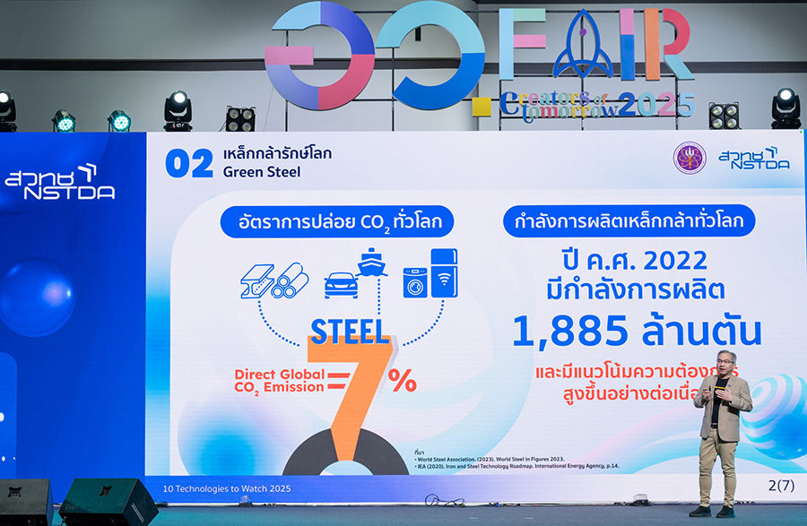 อุตสาหกรรมเหล็กและเหล็กกล้าปล่อยก๊าซคาร์บอนไดออกไซด์โดยตรงทั่วโลกราว 7% ถือว่าสูงที่สุดในบรรดาอุตสาหกรรมหนักทั้งหมด ปัจจุบันจึงมีแนวคิดการผลิต “เหล็กกล้าสีเขียวหรือเหล็กกล้ารักษ์โลก (Green Steel)” คือ เหล็กที่ผลิตโดยใช้กระบวนการและเทคโนโลยีที่ช่วยลดการปล่อยก๊าซคาร์บอนได- ออกไซด์ เปลี่ยนการผลิตแบบดั้งเดิม คือ BF-BOF ที่ใช้เตาหลอมแบบ Blast Furnace (BF) และ Basic Oxygen Furnace (BOF) มาสู่กระบวนการแบบใหม่ คือ “DRI-EAF (Direct Reduce Iron–Electric Arc Furnace)” นำพลังงานไฮโดรเจนสีเขียวมาใช้ในการผลิตเหล็กพรุน ก่อนนำมาหลอมรวมกับเศษเหล็กในเตาหลอมไฟฟ้าระบบอาร์ก (Electric Arc Furnace: EAF) ที่ใช้ไฟฟ้าจากแหล่งพลังงานหมุนเวียนตลอดกระบวนการผลิตจนได้เหล็กกล้าปลอดฟอสซิล ซึ่งช่วยลดการปล่อยก๊าซคาร์บอนไดออกไซด์ต่อการผลิตเหล็ก 1 ตัน จาก 2,300 กิโลกรัม เหลือ 200-600 กิโลกรัม