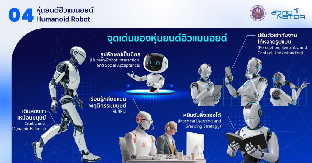 หุ่นยนต์ฮิวแมนอยด์ หรือ หุ่นยนต์ที่ออกแบบให้มีรูปร่างคล้ายมนุษย์ เป็นหนึ่งในเทคโนโลยีล้ำสมัย เพราะมี “ความอเนกประสงค์” ไม่ว่าจะเดินสองขาเหมือนมนุษย์ หยิบจับสิ่งของแม่นยำ หรือแม้แต่เรียนรู้และเลียนแบบพฤติกรรมจากการฝึกฝนในโลกเสมือน ที่สำคัญยังมีรูปลักษณ์ที่เป็นมิตร ปัจจุบันมีการพัฒนาหุ่นยนต์ฮิวแมนอยด์เพื่อนำไปใช้ในงานด้านต่าง ๆ เช่น หุ่นยนต์ Optimus ของบริษัท Tesla ใช้ในอุตสาหกรรมการผลิต, หุ่นยนต์ Atlas ของบริษัท Boston Dynamics ใช้ในสภาพแวดล้อมอันตรายและภัยพิบัติ และ หุ่นยนต์ Unitree G1 ของบริษัท Unitree Robotics เป็นฮิวแมนอยด์ที่เปรียบเหมือนเป็นร่างอวตารของ AI มีความยืดหยุ่นเหนือระดับคนทั่วไป และเคลื่อนไหวได้แบบไร้ขีดจำกัด
