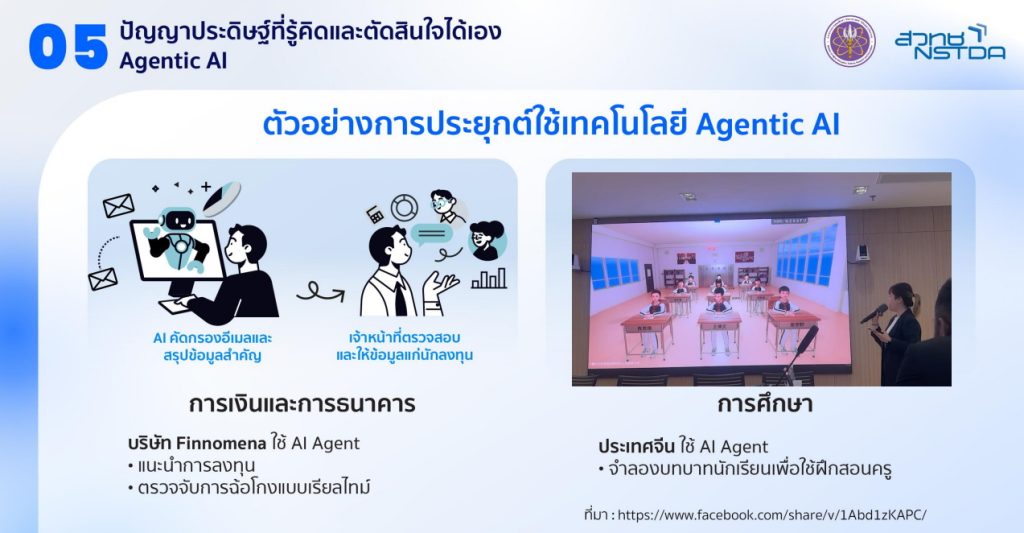 Agentic AI คือ ระบบปัญญาประดิษฐ์ที่เรียนรู้และพัฒนาตนเองจนวางแผนดำเนินงาน พร้อมปฏิบัติงานมุ่งเป้าและตัดสินใจเองได้ ทั้งยังเรียนรู้และปรับปรุงการทำงานเพื่อแก้ไขปัญหาเฉพาะหน้าได้ด้วย ปัจจุบัน Agentic AI มีทิศทางการพัฒนาไปสู่การสร้างระบบนิเวศของ AI ที่ซับซ้อนและทำงานร่วมกันได้มากขึ้น ผ่านระบบหลายตัวแทน หรือที่เรียกกันว่า AI Agent ซึ่งเริ่มนำไปประยุกต์ใช้ในแวดวงการเงินและการธนาคาร เช่น บริษัท Finnomena ใช้ AI Agent คัดกรองอีเมลจากพันธมิตรทางธุรกิจที่สำคัญ ก่อนจะวิเคราะห์ข้อมูลเพื่อส่งต่อไปยังนักลงทุน และยังใช้เพื่อตรวจจับการฉ้อโกงแบบเรียลไทม์ ขณะที่ประเทศจีนนำ AI Agent มาจำลองบทบาทนักเรียนที่มีบุคลิก ลักษณะนิสัย และความสามารถที่แตกต่างกัน เพื่อฝึกสอนครู สวทช. มีงานวิจัย Agentic AI ที่ใช้ช่วยเหลือคนพิการเข้าถึงข้อมูลข่าวสาร โดยประยุกต์ใช้สร้างคำบรรยายแทนเสียงแบบอัตโนมัติ ช่วยคนหูหนวกเข้าถึงข้อมูลด้วยการอ่านข้อความแทนการฟังเสียง