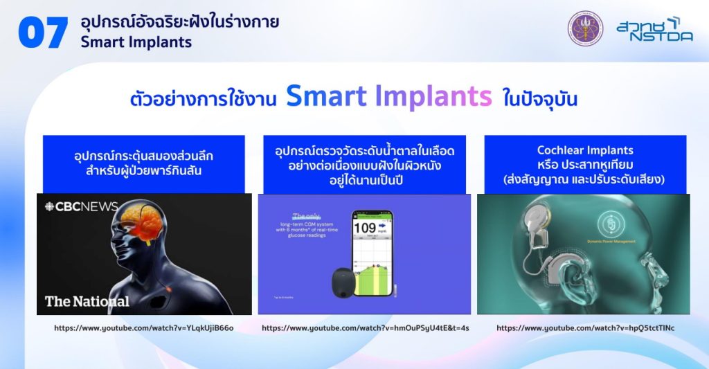 Smart Implants คือ อุปกรณ์ฝังในร่างกาย ที่นอกจากจะทำหน้าที่พื้นฐาน เช่น ทดแทนอวัยวะหรือช่วยการทำงานของอวัยวะบางส่วนแล้ว ยังตรวจวัดสัญญาณชีพ ประมวลผล และส่งข้อมูลสุขภาพแบบเรียลไทม์ อุปกรณ์ประเภทนี้มักประกอบด้วยเซนเซอร์ขนาดเล็ก ไมโครอิเล็กทรอนิกส์ ระบบสื่อสารไร้สาย และอัลกอริทึม AI เพื่อสนับสนุนการดูแลสุขภาพเฉพาะบุคคล ปัจจุบันมีการใช้งาน Smart Implants ในหลายรูปแบบ เช่น อุปกรณ์กระตุ้นสมองส่วนลึก สำหรับผู้ป่วยพาร์กินสันที่ควบคุมอาการสั่นได้ และบางรุ่นสามารถตรวจจับคลื่นสมองเพื่อปรับแรงกระตุ้นได้อัตโนมัติ อุปกรณ์ตรวจวัดระดับน้ำตาลในเลือดอย่างต่อเนื่องแบบฝังในผิวหนัง เช่น Eversense CGM ที่ติดตามค่ากลูโคสได้ยาวนานถึง 365 วันโดยไม่ต้องเปลี่ยนเซนเซอร์บ่อย ๆ และประสาทหูเทียมอัจฉริยะที่ส่งสัญญาณและปรับระดับเสียงได้ พร้อมด้วยหน่วยความจำสำหรับจัดเก็บข้อมูลการได้ยิน เช่น Cochlear Nucleus Nexa