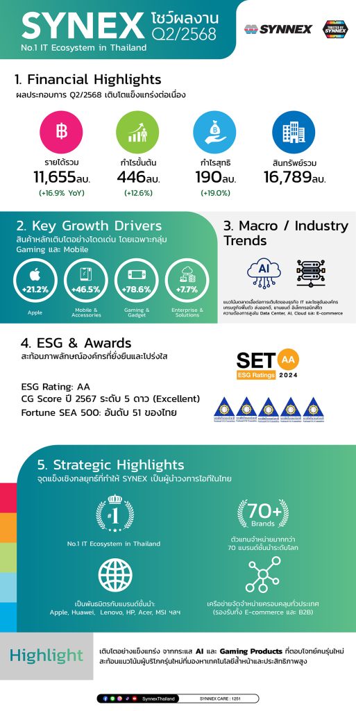 นางสาวสุธิดา มงคลสุธี ประธานเจ้าหน้าที่บริหาร บริษัท ซินเน็ค (ประเทศไทย) จำกัด (มหาชน) หรือ SYNEX ดิสทริบิวเตอร์ผู้นำด้านไอทีอีโคซิสเต็ม เปิดเผยว่า ผลประกอบการไตรมาส 2 ปี 2568 ฟอร์มแข็งแกร่งแม้เป็นช่วงโลว์ซีซั่นของตลาดไอที โดยมีรายได้จากการขายและบริการกว่า 11,655 ล้านบาท เติบโต 16.9% จากช่วงเดียวกันของปีก่อน จากการเติบโตในทุกกลุ่มสินค้าหลัก โดยเฉพาะกลุ่ม Smartphone และ Apple ด้านกำไรขั้นต้นอยู่ที่ 446 ล้านบาท เพิ่มขึ้น 12.6% และมีกำไรสุทธิ 190 ล้านบาท เติบโต 19% ปัจจัยสนับสนุนหลักมาจากยอดขายที่ขยายตัวทุกกลุ่มผลิตภัณฑ์ ภายใต้กลยุทธ์เชิงรุก ควบคู่การบริหารต้นทุนอย่างมีประสิทธิภาพ และการรับรู้ส่วนแบ่งกำไรจากบริษัทร่วมที่เพิ่มขึ้น ส่งผลให้งวด 6 เดือนแรกของปี 2568 บริษัทมีรายได้รวม 22,814 ล้านบาท เติบโต 16.6% กำไรขั้นต้น 871 ล้านบาท เพิ่มขึ้น 8.6% และมีกำไรสุทธิ 378 ล้านบาท เติบโต 21.4%