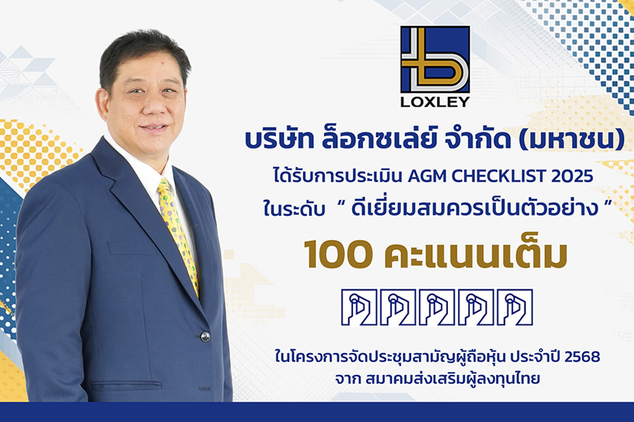 บริษัท ล็อกซเล่ย์ จำกัด (มหาชน) ได้รับคะแนนประเมินคุณภาพการจัดประชุมสามัญผู้ถือหุ้นประจำปี 2568 (AGM Checklist) เต็ม 100 คะแนน ต่อเนื่องเป็นปีที่ 4 ติดต่อกัน (2565–2568) จากสมาคมส่งเสริมผู้ลงทุนไทย (Thai Investors Association: TIA) ภายใต้ภารกิจของสำนักงานคณะกรรมการกำกับหลักทรัพย์และตลาดหลักทรัพย์ (ก.ล.ต.) ถือเป็นการตอกย้ำจุดยืนของ LOXLEY ในการเป็นองค์กรที่ดำเนินธุรกิจด้วยความโปร่งใส ยึดมั่นในหลักธรรมาภิบาล และเคารพสิทธิของผู้ถือหุ้นอย่างสูงสุด