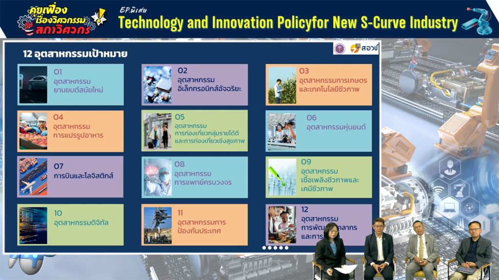 ขณะที่ ดร.กิติพงค์ กล่าวว่า เดิมรัฐบาลสร้าง S-Curve จาก 5 อุตสาหกรรมหลัก ได้แก่ อาหาร ยานยนต์ ท่องเที่ยว เกษตรชีวภาพ อิเล็กทรอนิกส์ แต่ไม่เพียงพอในการยกระดับประเทศ จึงต้องมี New S-Curve อย่าง เซมิคอนดักเตอร์ การแพทย์ขั้นสูง ดิจิทัล และชีวภาพ ซึ่งรัฐบาลได้จัดตั้งกองทุนเพิ่มขีดความสามารถที่บีโอไอเป็นผู้ดูแลแล้ว อย่างไรก็ตาม ผู้ประกอบการไทยยังเผชิญ ข้อจำกัด ทั้งการแข่งขันด้านภาษีและสินค้าจีนที่ทะลักเข้าตลาดโลก สิ่งที่ยังขาดคือ การบริหารจัดการนวัตกรรม และการยกระดับ 6 ด้านหลัก ได้แก่ ตลาด, ผลิตภาพ, นวัตกรรม, คน, ESG และทุน