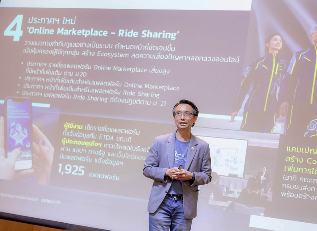 พร้อมกันนี้ ETDA ยังเดินหน้าอย่างต่อเนื่องเพื่อยกระดับการทำธุรกรรมออนไลน์ผ่านบริการแพลตฟอร์มดิจิทัลของคนไทยให้ปลอดภัย น่าเชื่อถือ ด้วยการเร่งเครื่องกลไกร่วมกำกับ ร่วมกับหน่วยงานกำกับดูแลอื่น ๆ ที่เกี่ยวข้อง ตลอดจนหน่วยงานภาครัฐ เอกชน และผู้ให้บริการแพลตฟอร์มดิจิทัล ภายใต้ประกาศฯ และข้อเสนอแนะต่างๆ ที่พร้อมใช้งานแล้ว อาทิ คู่มือการพิสูจน์และยืนยันตัวตนเพื่อลงทะเบียนผู้ใช้บริการบนแพลตฟอร์มดิจิทัล คู่มือการดูแลโฆษณาออนไลน์บนแพลตฟอร์มดิจิทัล คู่มือการดูแลเกี่ยวกับการขายสินค้าที่ต้องมีมาตรฐานของสินค้าบนบริการแพลตฟอร์มดิจิทัล และ ขมธอ. 32-2565 ว่าด้วยการรวบรวม กลั่นกรอง และเผยแพร่รีวิวของผู้บริโภคบนช่องทางออนไลน์ รวมไปถึงประกาศฉบับใหม่ที่ครอบคลุมทั้งแพลตฟอร์มประเภท Online Marketplace และ Ride Sharing เพื่อกำหนดหน้าที่เพิ่มเติมให้กับแพลตฟอร์มที่เข้าข่ายให้มีทิศทางการกำกับดูแลบริการของตนเอง (Self-Regulation) อย่างเป็นระบบ