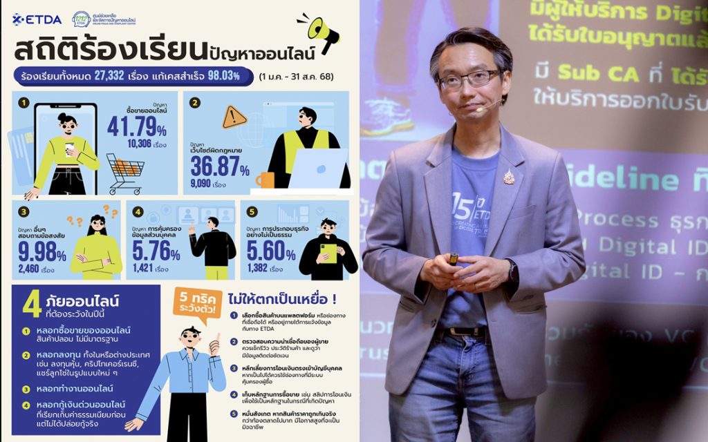 ดร.ชัยชนะ มิตรพันธ์ ผู้อำนวยการสำนักงานพัฒนาธุรกรรมทางอิเล็กทรอนิกส์ หรือ ETDA (เอ็ตด้า) เปิดเผยว่า ปัญหาภัยหลอกลวงออนไลน์ยังคงเป็นความท้าทายสำคัญของประเทศ โดยเฉพาะในยุคที่ช่องทางดิจิทัลเข้าถึงง่ายและรวดเร็ว กลายเป็นโอกาสให้มิจฉาชีพฉกฉวยประโยชน์จากประชาชน จากข้อมูลของศูนย์ช่วยเหลือและจัดการปัญหาออนไลน์ หรือ1212 ETDA ในช่วง 8 เดือนแรก (เดือน มกราคม-สิงหาคม) ของปี 2568 พบ เรื่องเรียนปัญหาออนไลน์ที่ผู้บริโภคร้องเรียนผ่านช่องทางรับเรื่องของ 1212 ETDA สูงถึง 27,332 เรื่อง โดยเรื่องที่ได้รับการร้องเรียนมากที่สุด 5 อันดับแรก ได้แก่ ปัญหาซื้อขายสินค้าออนไลน์ 10,306 เรื่อง คิดเป็นร้อยละ 41.79 รองลงมาได้แก่ปัญหาเว็บไซต์ผิดกฎหมายอยู่ที่ 9,090 เรื่อง (ร้อยละ 36.87) ขณะที่มีผู้ขอคำปรึกษาแนวทางเอกสารในการแจ้งเรื่อง รวมถึงปัญหาอื่น ๆ 2,460 เรื่อง (ร้อยละ 9.98) ปัญหาด้านการคุ้มครองข้อมูลส่วนบุคคลร้อยละ 1,421 เรื่อง (ร้อยละ 5.76) และปัญหาด้านการประกอบธุรกิจอย่างไม่เป็นธรรมอยู่ที่ 1,382 เรื่อง (ร้อยละ 5.60)
