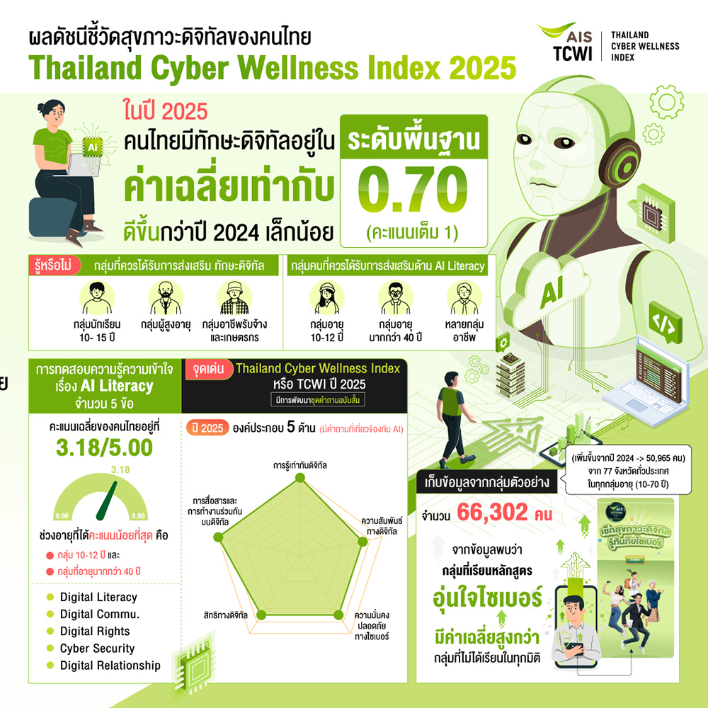 บริษัท แอดวานซ์ อินโฟร์ เซอร์วิส จำกัด (มหาชน) หรือ AIS ในฐานะผู้ให้บริการดิจิทัลชั้นนำของไทย ที่มุ่งส่งเสริมการใช้งานที่ถูกต้องปลอดภัยและเหมาะสมให้กับลูกค้าและคนไทย เปิดเผย “ผลดัชนีชี้วัดสุขภาวะดิจิทัลของคนไทย Thailand Cyber Wellness Index 2025” ซึ่งจัดทำขึ้นเป็นปีที่ 3 ครอบคลุมกลุ่มตัวอย่างจำนวน 66,302 คน ครอบคลุม 77 จังหวัดทั่วประเทศ เพื่อสะท้อนระดับความรู้ ทักษะ และพฤติกรรมของคนไทยในการใช้งานเทคโนโลยีดิจิทัลอย่างปลอดภัย มีจริยธรรม และเคารพสิทธิของผู้อื่น โดยมุ่งหวังให้ดัชนีนี้เป็นเสมือน “เข็มทิศ” สำหรับกำหนดทิศทางด้านนโยบาย การศึกษา การสื่อสาร และความร่วมมือระหว่างภาครัฐ ภาคเอกชน และภาคประชาสังคม เพื่อร่วมกันสร้างสังคมดิจิทัลที่ปลอดภัยและยั่งยืน