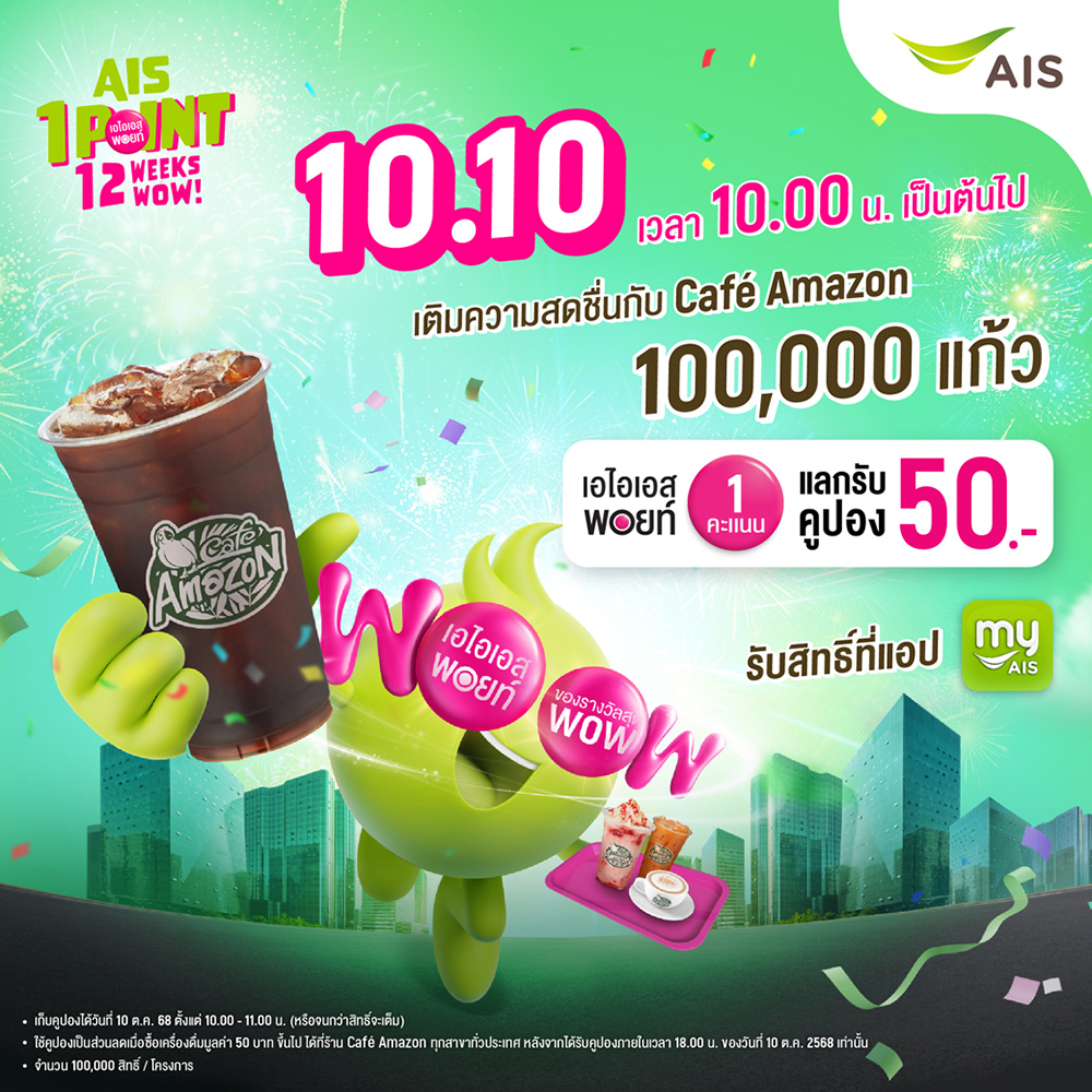 เอไอเอส ฉลองครบรอบ 35 ปี ขอแทนคำขอบคุณลูกค้ากว่า 51 ล้านรายทั่วประเทศ ที่ไว้วางใจและเติบโตไปพร้อมกัน ด้วยการเติมเต็มทุกโมเมนต์ความสุข ผ่านแคมเปญสุดยิ่งใหญ่ “AIS 1 POINT 12 WEEKS 12 WOW” ใช้ AIS Points เพียง 1 คะแนน เตรียมแลกรับสิทธิพิเศษสุดว้าวได้ต่อเนื่อง 12 สัปดาห์ ตลอด 3 เดือนเต็ม เอไอเอสตั้งใจมอบทุกเซอร์ไพรส์ความ WOW ให้ลูกค้าต่อเนื่องตลอดทั้งแคมเปญ และในวันที่ 10 ตุลาคม 2568 นี้ ขอมอบของขวัญความ WOW ครั้งใหญ่ ให้ลูกค้าใช้ AIS Points 1 คะแนน แลกรับฟรี! คูปองส่วนลดเครื่องดื่ม Café Amazon มูลค่า 50 บาท ได้เลยทันที วันเดียวเท่านั้น! ผ่านแอป myAIS ตั้งแต่เวลา 10.00 น. – 11.00 น. (หรือจนกว่าสิทธิ์จะเต็ม) โดยแจกความสดชื่นแบบจัดหนักถึง 100,000 แก้ว ให้คนไทยได้สดชื่นไปพร้อมกันทั้งประเทศ พร้อมแล้วก็เตรียมแอป myAIS ให้พร้อม และเตรียมเอไอเอส พอยท์ไว้รอได้เลย สามารถดูรายละเอียดเพิ่มเติมได้ที่ https://m.ais.co.th/9WHxlJxtG