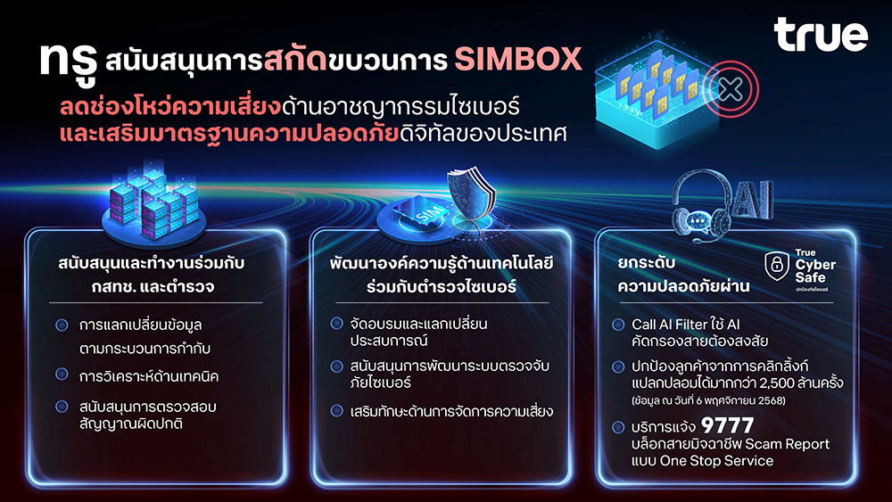 ที่ผ่านมา ทรู มุ่งมั่นสกัดกั้นกลโกงมิจฉาชีพที่ซับซ้อนและเปลี่ยนรูปแบบตลอดเวลา ควบคู่กับการยกระดับความปลอดภัยผ่าน True CyberSafe เกราะป้องกันภัยดิจิทัลสำหรับลูกค้าด้วยบริการ Call AI Filter คัดกรองสายต้องสงสัยด้วย AI และช่วยปกป้องลูกค้าจากการคลิกลิ้งก์แปลกปลอมไปแล้วกว่า 2,531,905,914 ล้านครั้ง (ข้อมูล ณ วันที่ 6 พฤศจิกายน 2568) นอกจากนี้ยังมีบริการแจ้ง 9777 บล็อกสายมิจฉาชีพ Scam Report แบบ One Stop Service ให้ประชาชนแจ้งบล็อกสายต้องสงสัยได้ทันที พร้อมผสานส่งต่อข้อมูลให้เจ้าหน้าที่ตำรวจอย่างรวดเร็ว ความร่วมมือครั้งนี้ ตอกย้ำการทำงานเชิงรุกร่วมกับทุกภาคส่วนแบบไร้รอยต่อ ปิดทางโทรหลอกลวงและเสริมสร้างความปลอดภัยทางดิจิทัลของประเทศอย่างต่อเนื่อง