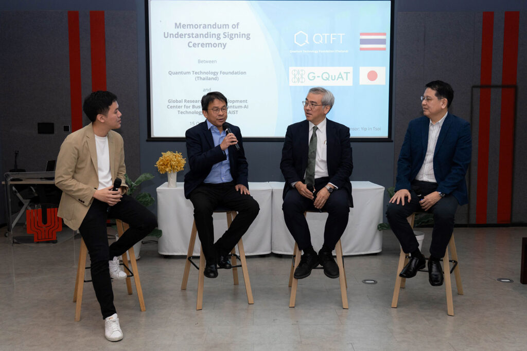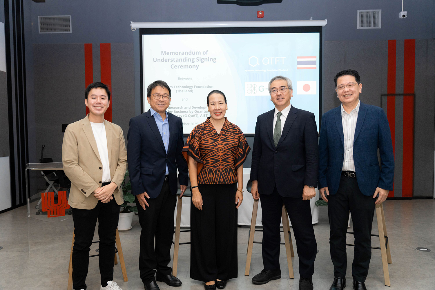 ดร.จิรวัฒน์ ตั้งปณิธานนท์ ประธานเจ้าหน้าที่บริหารและผู้ร่วมก่อตั้ง บริษัท Quantum Technology Foundation (Thailand) Co., Ltd. (QTFT) (ซ้าย) และ ศาสตราจารย์ มาซุ คาซูยะ ผู้อำนวยการศูนย์ G-QuAT สถาบันเทคโนโลยีอุตสาหกรรมขั้นสูงแห่งชาติ (AIST) ประเทศญี่ปุ่น (ขวา) ได้ลงนามในบันทึกความเข้าใจ (MOU) เพื่อร่วมกันพัฒนาเทคโนโลยี Quantum Computing สู่การใช้งานในภาคอุตสาหกรรมจริง โดยมีบริษัท ยิบอินซอย ทำหน้าที่เป็นตัวกลางสำคัญในการประสานความร่วมมือระหว่างภาคเทคโนโลยี ภาคการเงิน และภาครัฐ เพื่อให้ประเทศไทยสามารถนำควอนตัมคอมพิวติ้งเข้าสู่ระบบเศรษฐกิจได้อย่างเป็นรูปธรรม