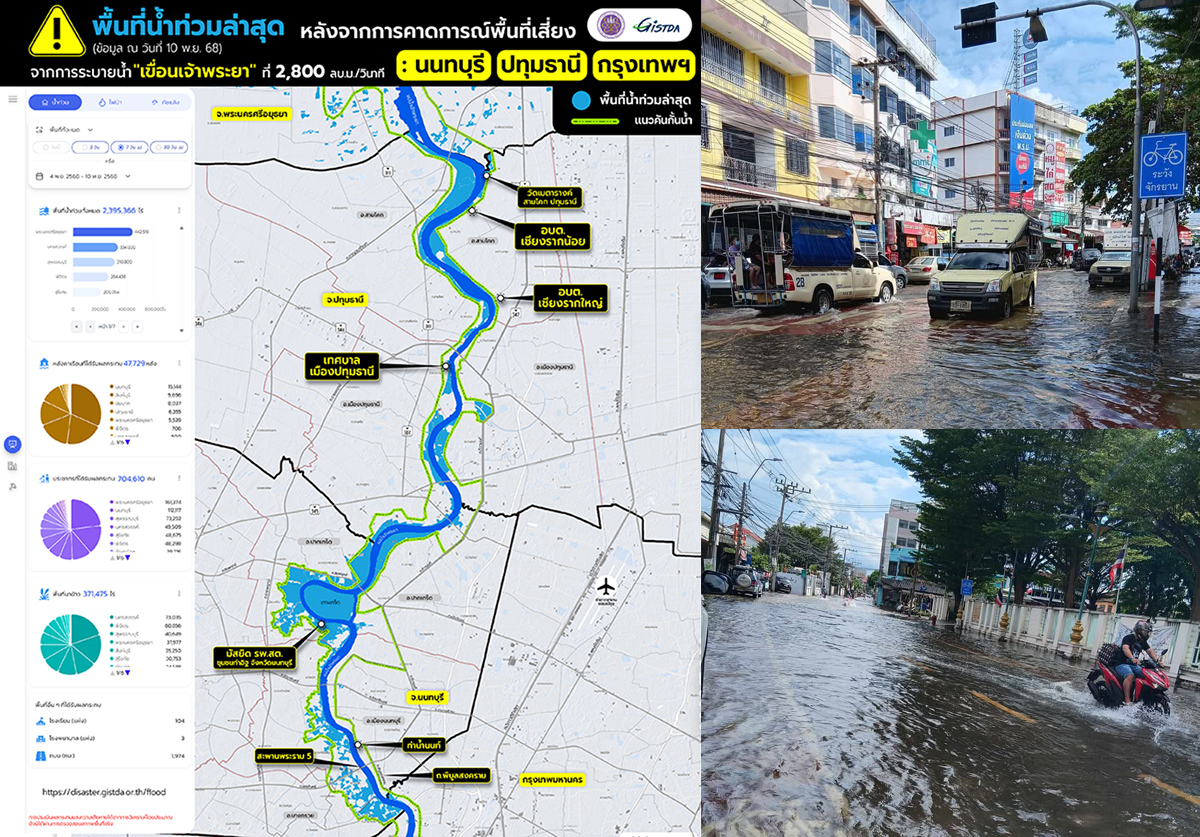 สิ่งที่น่าสนใจคือ จากการคาดการณ์เมื่อปลายเดือนตุลาคมที่ผ่านมา ซึ่งสอดคล้องกับสถานการณ์จริง แสดงให้เห็นถึงความแม่นยำของการใช้ข้อมูลจากดาวเทียมและเทคโนโลยีอวกาศผสานกับแบบจำลองภูมิประเทศและข้อมูลการระบายน้ำของกรมชลประทาน ทำให้สามารถประเมินแนวโน้มพื้นที่เสี่ยงได้ล่วงหน้าอย่างมีประสิทธิภาพ ซึ่งข้อมูลดังกล่าวจึงกลายเป็นเครื่องมือสำคัญสำหรับการบริหารจัดการภัยพิบัติ โดยเฉพาะในพื้นที่ปลายแม่น้ำเจ้าพระยาที่มักได้รับผลกระทบจากการระบายน้ำช่วงปลายฤดูฝนของทุกปี