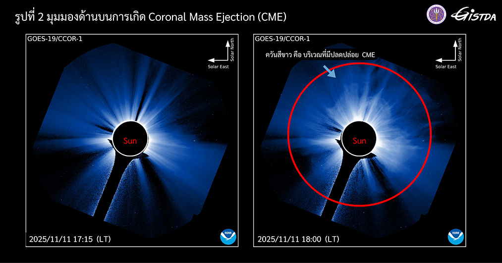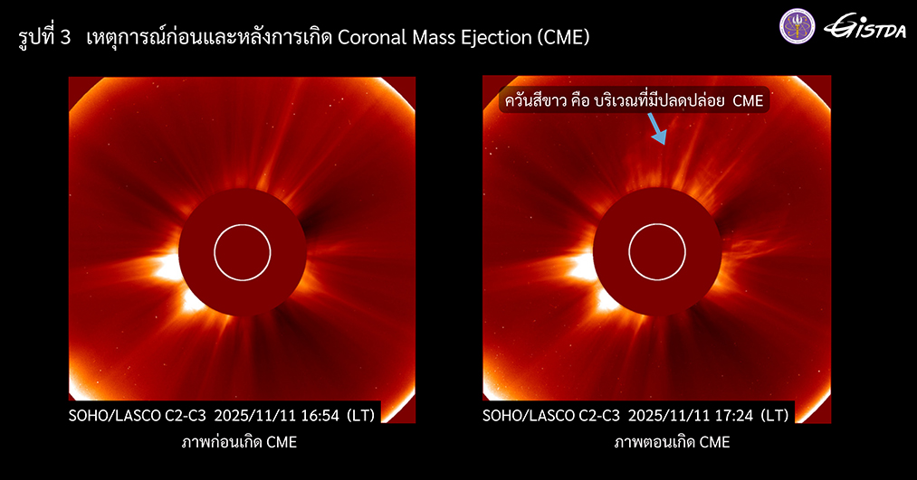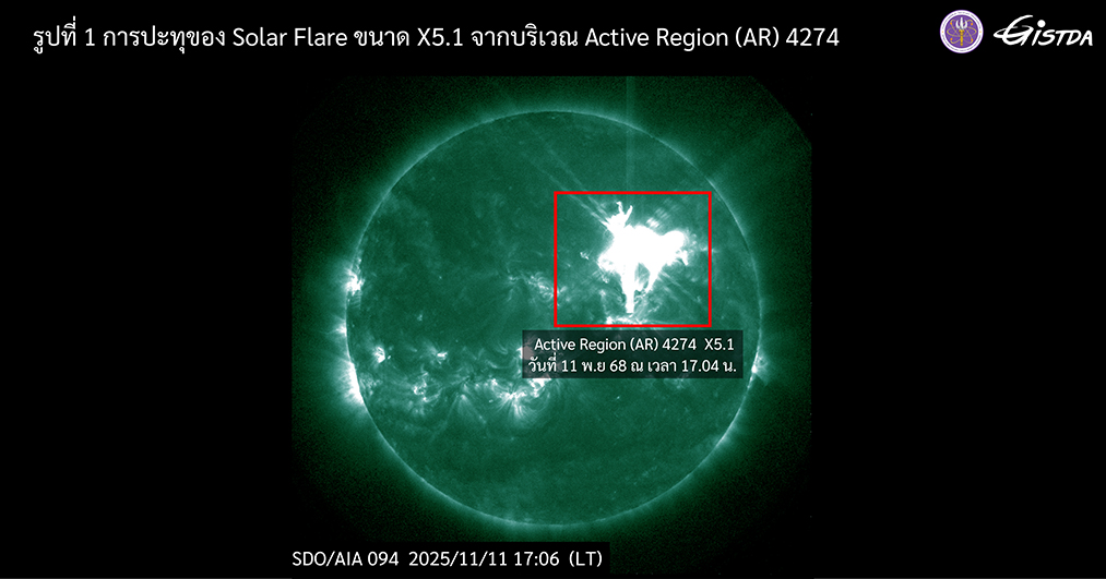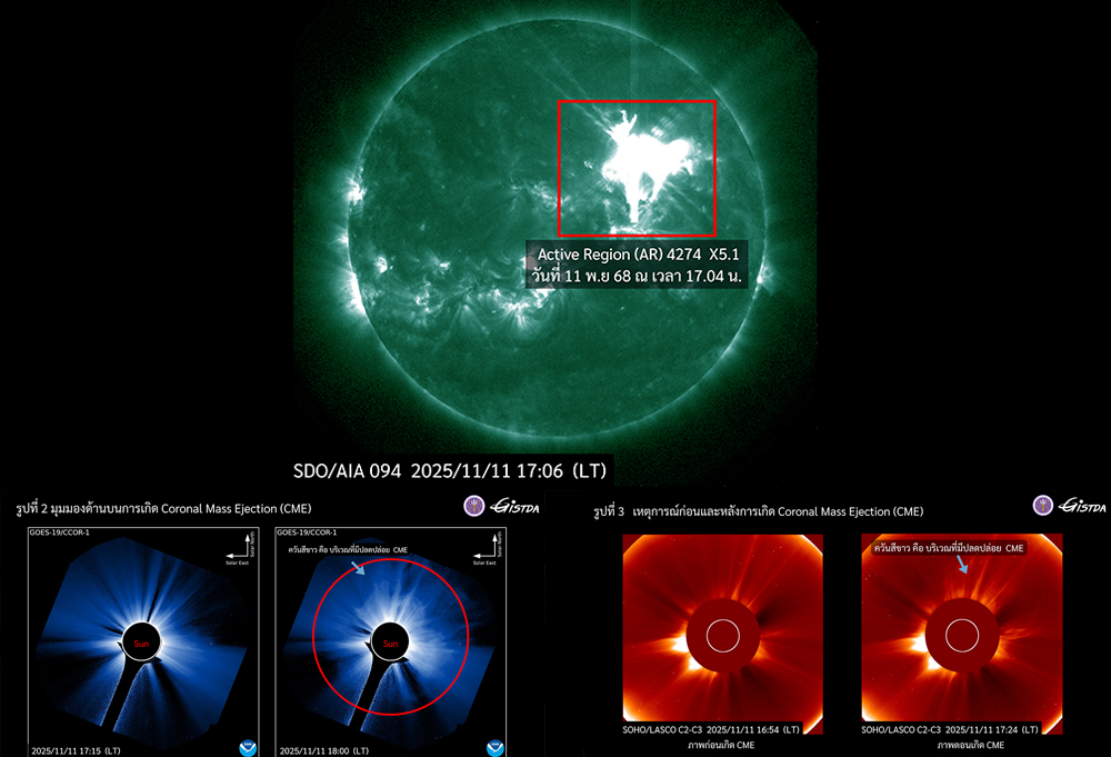 เมื่อวันอังคารที่ 11 พฤศจิกายน 2568 เกิดการปะทุของเปลวสุริยะขนาดใหญ่ระดับ X5.1 (รูปที่ 1) ซึ่งจัดอยู่ในระดับรุนแรงสูงสุด พร้อมกับการปล่อยมวลโคโรนาแบบสมบูรณ์ (Full Halo CME) ที่พุ่งตรงมายังโลก
