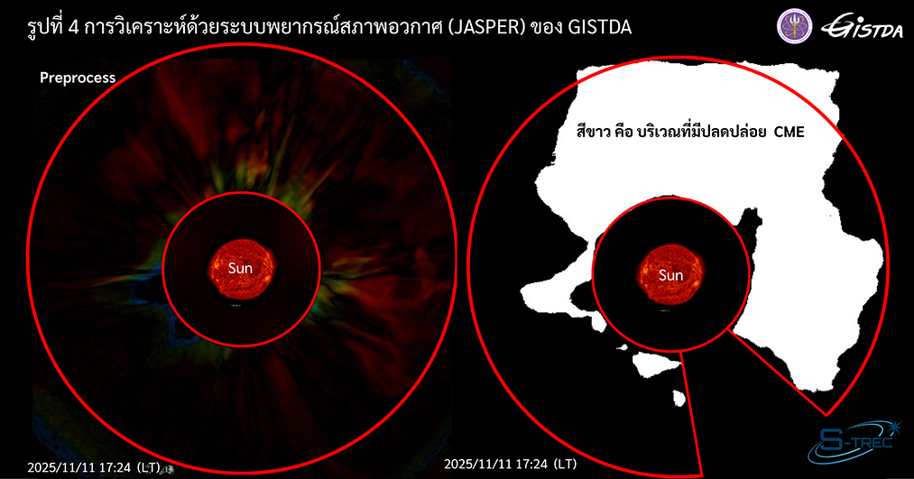 ทาง GISTDA ได้ติดตามพายุสนามแม่เหล็กโลกตั้งแต่วันที่ 11 – 12 พฤศจิกายน 2568 มวลโคโรนาจำนวนมหาศาล และวิเคราะห์ด้วยระบบพยากรณ์สภาพอวกาศ หรือ JASPER ตามรูปที่ 2-4 จากเหตุการณ์ดังกล่าวได้เดินทางมาถึงโลก และส่งผลให้เกิดพายุแม่เหล็กโลกระดับ G4 (Severe Geomagnetic Storm) (รูปที่ 5)