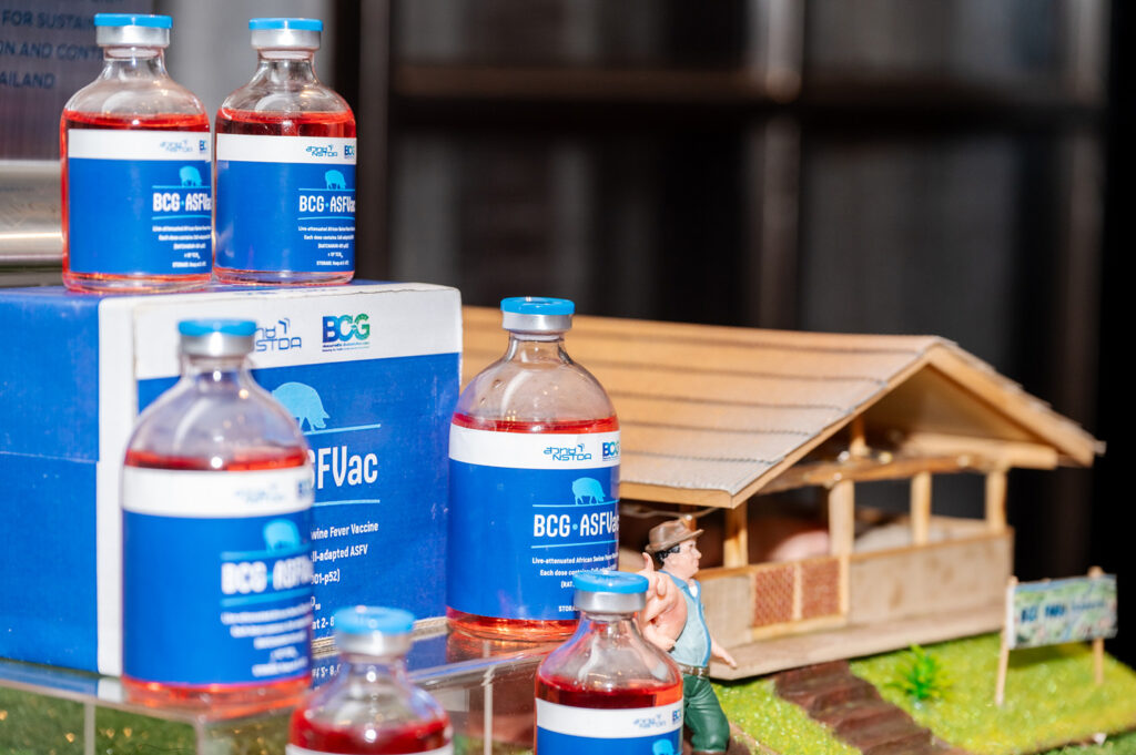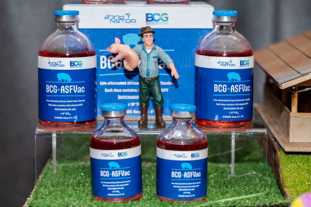 ทีมวิจัยเร่งศึกษาสร้างองค์ความรู้เกี่ยวกับไวรัส ASF เทคโนโลยี จนถึงการพัฒนาวัคซีนต้นแบบ โดยอาศัยฐานเทคโนโลยีแพลตฟอร์มที่ไบโอเทค สวทช. สั่งสมมายาวนาน จนกระทั่งพัฒนา “วัคซีน ASF ต้นแบบชนิดเชื้อเป็นอ่อนฤทธิ์” จาก “ไวรัสสายพันธุ์ไทย” ได้สำเร็จ รวมทั้งมีการทดสอบและประเมินประสิทธิผล ความปลอดภัย ผลข้างเคียง และการตอบสนองทางภูมิคุ้มกันอย่างเป็นระบบในสุกร ภายใต้ความร่วมมือกับกรมปศุสัตว์ เกษตรกร และสัตวแพทย์ควบคุมฟาร์ม เพื่อศึกษาปัจจัยต่าง ๆ อย่างรอบด้าน