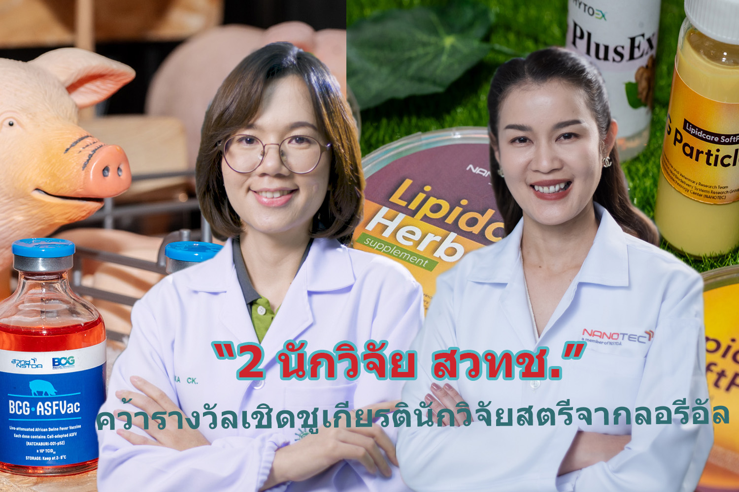 นักวิจัยหญิงเก่ง ท่านแรกคือ “ดร. สพ.ญ.ฌัลลิกา แก้วบริสุทธิ์” จาก ศูนย์พันธุวิศวกรรมและเทคโนโลยีชีวภาพแห่งชาติ (ไบโอเทค) สวทช. เจ้าของผลงาน “ต้นแบบวัคซีนโรคอหิวาต์แอฟริกาในสุกร” ส่วนอีกท่านคือ “ดร.มัตถกา คงขาว” จากศูนย์นาโนเทคโนโลยีแห่งชาติ (นาโนเทค) สวทช. เจ้าของผลงาน “การพัฒนาอนุภาคนาโนไขมันดัดแปลงพื้นผิวเพื่อนำส่งยารักษาโรคไม่ติดต่อเรื้อรัง”
