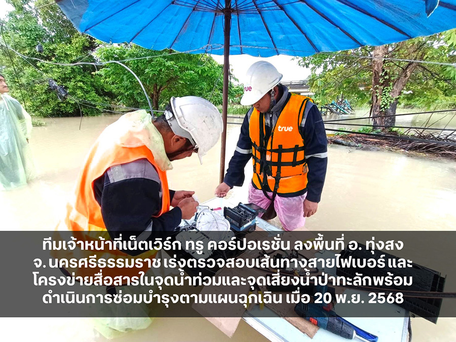 “โมเดลทุ่งสง” คือแนวทางที่ทรู คอร์ปอเรชั่นใช้ดูแลโครงข่ายในภาวะน้ำท่วมพื้นที่ อำเภอทุ่งสง และอีกหลายอำเภอของ จังหวัดนครศรีธรรมราช โดยเร่งส่งทีมวิศวกรและทีมเน็ตเวิร์กลงพื้นที่ตรวจเช็กและปกป้องสายไฟเบอร์เส้นหลักที่เป็นเส้นเลือดใหญ่ของโครงข่ายก่อนเป็นลำดับแรก จากนั้นเร่งดูแลสถานีฐานและจุดสื่อสารสำคัญในพื้นที่น้ำท่วมและจุดเสี่ยงน้ำป่าทะลัก ตามแผนฉุกเฉิน เพื่อให้มือถือและเน็ตบ้านของประชาชนยังใช้งานได้ต่อเนื่อง แม้อยู่ท่ามกลางสถานการณ์อพยพและการประสานงานช่วยเหลือจากทุกหน่วยงานได้อย่างต่อเนื่อง