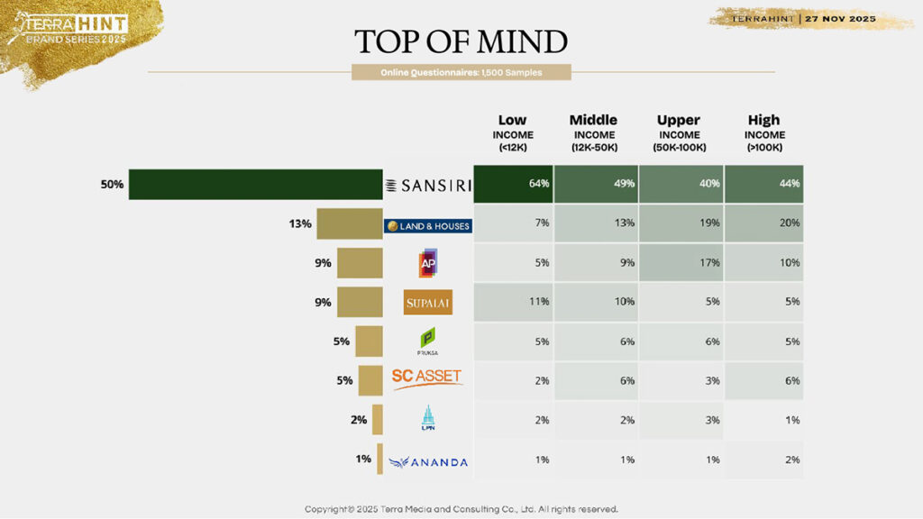 บริษัท แสนสิริ จำกัด (มหาชน) ตอกย้ำความเป็นผู้นำวงการอสังหาริมทรัพย์ไทย ด้วยการคว้า 2 รางวัลสูงสุดแห่งปีจากเวที Terra BKK เวทีสัมมนาด้านอสังหาริมทรัพย์ประจำปี “TerraHint Brand Series 2025 ภายใต้ธีม The Wellness Blueprint #อยู่ดีมีสูตร โดยแสนสิริคว้ารางวัลสูงสุดของเวทีปีนี้ “Hall of Fame” ที่สะท้อนถึงความสำเร็จในการสร้างแบรนด์ที่ทรงพลังในธุรกิจอสังหาริมทรัพย์ หรือ “The Most Powerful Real Estate Brand” ต่อเนื่องมาตลอด 7 ปี รวมทั้งในปีนี้ซึ่งครองแชมป์เป็นปีที่ 8 (2017 – 2025) โดดเด่นด้วยคะแนนยอดเยี่ยมใน 7 มิติสำคัญ ทั้งความหลากหลายของโครงการ คุณภาพที่เป็นที่ยอมรับ สร้างความแตกต่างในตลาด Brand Love และเป็นแบรนด์เป็นที่นิยมในไทย รวมทั้งยังนับเป็นบริษัทอสังหาริมทรัพย์ไทยเพียงรายเดียว ที่คว้าได้ถึง 2 รางวัลต่อเนื่อง 2 ปีซ้อน โดยอีกหนึ่งรางวัลคือ “Wellness & Sustainability Leader” ซึ่งเป็นรางวัลผู้นำด้าน Wellness Residence และการพัฒนาอย่างยั่งยืน พร้อมยกระดับมาตรฐานการอยู่อาศัยอย่างแท้จริง