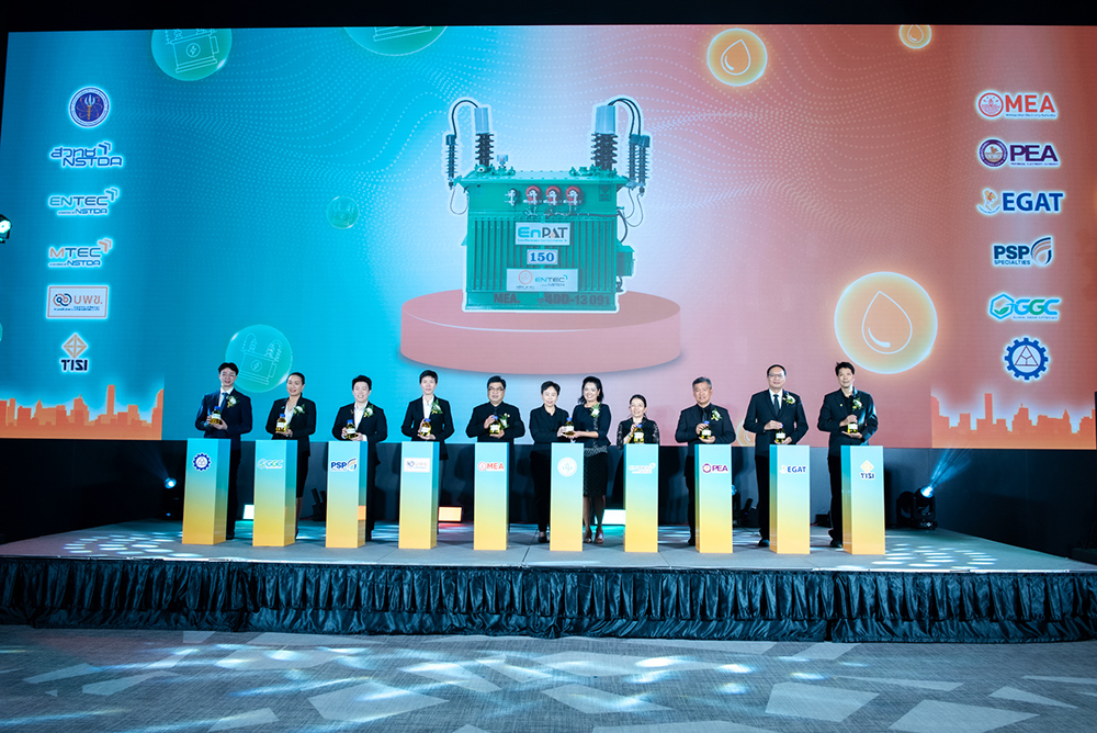 การไฟฟ้านครหลวง สำนักงานใหญ่ กรุงเทพฯ : นายดิเรก บุญปิยทัศน์ รองผู้ว่าการวางแผนและนวัตกรรมระบบไฟฟ้า การไฟฟ้านครหลวง (กฟน.) เป็นประธานในงานแถลงข่าวการใช้งาน EnPAT น้ำมันหม้อแปลงไฟฟ้าปลอดภัยจากปาล์มน้ำมันไทยในระบบไฟฟ้าสังคมเมือง ร่วมกับการไฟฟ้านครหลวง “EnPAT พลังแห่งนวัตกรรม เพื่อขับเคลื่อนมหานครสู่อนาคตที่ยั่งยืน” พร้อมด้วย รศ. ดร.ทวิดา กมลเวชช รองผู้ว่าราชการกรุงเทพมหานคร ผศ. ดร.กานดา บุญโสธรสถิตย์ ผู้อำนวยการหน่วยบริหารและจัดการทุนด้านการเพิ่มความสามารถในการแข่งขันของประเทศ (บพข.) ดร.สุมิตรา จรสโรจน์กุล ผู้อำนวยการศูนย์เทคโนโลยีพลังงานแห่งชาติ (ENTEC) สวทช. ดร.บุญญาวัณย์ อยู่สุข หัวหน้าทีมพัฒนา EnPAT และหัวหน้าทีมวิจัยเทคโนโลยีเชื้อเพลิงสะอาดและเคมีขั้นสูง กลุ่มวิจัยพลังงานคาร์บอนต่ำ ศูนย์เทคโนโลยีพลังงานแห่งชาติ (ENTEC) สวทช. และผู้แทนจากหน่วยงานสำคัญ ได้แก่ นายไตรภพ เธียรถาวร กองบริหารจัดการหม้อแปลงระบบจำหน่าย การไฟฟ้าส่วนภูมิภาค (กฟภ.) นายสุเทพ สิงหฤกษ์ ผู้อำนวยฝ่ายบริหารจัดการสินทรัพย์ระบบส่ง การไฟฟ้าฝ่ายผลิตแห่งประเทศไทย (กฟผ.) นายอาศิรวรรธน์ โพธิพันธุ์ นักวิชาการมาตรฐานชำนาญการพิเศษ สำนักงานมาตรฐานผลิตภัณฑ์อุตสาหกรรม (สมอ.) นายเสกสรร ครองพาณิชย์ กรรมการบริหารและรองประธานเจ้าหน้าที่บริหาร บริษัท พี.เอส.พี.สเปเชียลตี้ส์ จำกัด (มหาชน) ดร.ธัญญรัตน์ บุญถีกูล ผู้จัดการฝ่ายงานการตลาดและพัฒนาธุรกิจ บริษัท โกลบอลกรีนเคมิคอล จำกัด (มหาชน)และนายกวิน กิตติรัตนวิวัฒน์ ผู้ช่วยผู้จัดการฝ่ายผลิต บริษัท เจริญชัยหม้อแปลงไฟฟ้า จำกัด