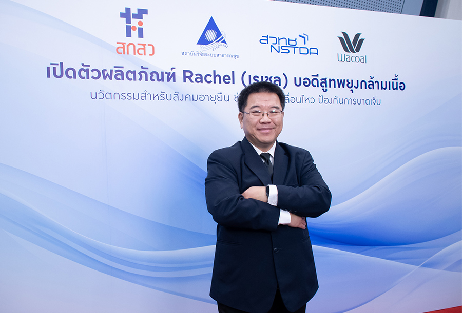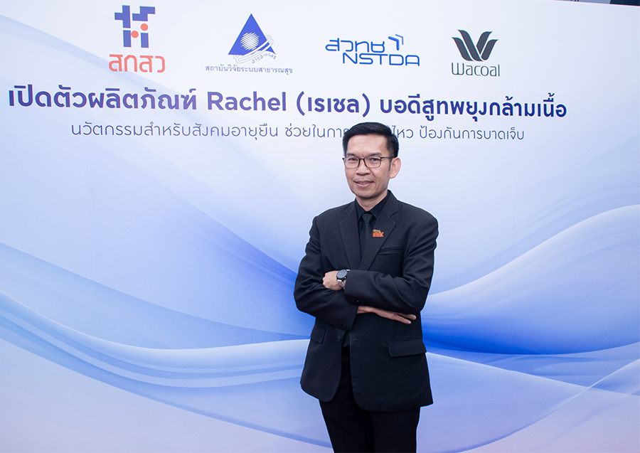 รศ.ดร.เติมศักดิ์ ศรีคิรินทร์ ผู้อำนวยการศูนย์เทคโนโลยีโลหะและวัสดุแห่งชาติ (เอ็มเทค) สวทช. กล่าวว่า สวทช. ในฐานะ “ขุมพลังหลักด้านวิทยาศาสตร์และเทคโนโลยีของประเทศ” มุ่งมั่นที่จะนำวิทยาศาสตร์และเทคโนโลยีสู่การปฏิบัติจริง โดยเฉพาะอย่างยิ่งในการยกระดับคุณภาพชีวิตและสุขภาพของประชาชน ซึ่งนวัตกรรม “เรเชล”เป็นเทคโนโลยีเอ็กโซสูท (Exosuit) ที่วิจัยพัฒนาเพื่อตอบโจทย์การก้าวเข้าสู่สังคมสูงวัยอย่างสมบูรณ์ของประเทศไทย โดยได้รับทุนสนับสนุนวิจัยจากสถาบันวิจัยระบบสาธารณสุข (สวรส.) และสำนักงานคณะกรรมการส่งเสริมวิทยาศาสตร์ วิจัยและนวัตกรรม (สกสว.) ตั้งแต่ปี 2565 เป้าหมายหลักคือการยืดช่วง Active Aging หรือช่วงเวลาที่ผู้สูงวัยยังมีความสุขกับการใช้ชีวิตด้วยตนเอง ซึ่งช่วยสนับสนุนการลดความเหลื่อมล้ำทางสังคม ให้ผู้สูงอายุสามารถใช้ชีวิตโดยอาศัยการดูแลสุขภาพได้ด้วยตนเองนานที่สุด ก่อนจะเข้าสู่ภาวะพึ่งพิงนี่คือ ตัวอย่างที่ชัดเจนของกลไก From Lab to Market หรือ การพัฒนาขึ้นในห้องปฏิบัติการไปพัฒนาต่อยอดและนำออกจำหน่ายในตลาดที่มุ่งสร้างผลกระทบและวัดผลได้จริง