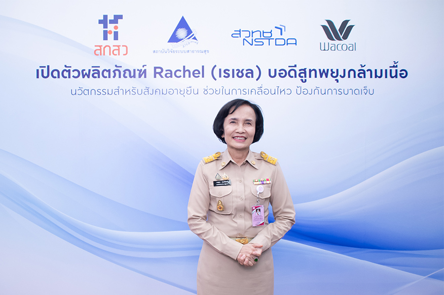 นพ.ศุภกิจ ศิริลักษณ์ ผู้อำนวยการสถาบันวิจัยระบบสาธารณสุข (สวรส.) กล่าวว่า การเข้าสู่สังคมสูงวัยอย่างสมบูรณ์เป็นความท้าทายสำคัญของระบบสุขภาพไทย โดยเฉพาะปัญหาการหกล้มซึ่งเป็นภาระหนักทั้งต่อผู้ป่วยและงบประมาณด้านสาธารณสุข ชุดบอดีสูท “เรเชล” จึงช่วยให้ผู้สูงวัยเคลื่อนไหวได้มั่นคงและอิสระลดความเสี่ยงการบาดเจ็บ และเสริมสุขภาวะทั้งกายและใจ สวรส. สนับสนุนทุนวิจัยตั้งแต่ปี 2565 เพื่อพัฒนา“เรเชล” ให้ตอบโจทย์กลุ่ม “พฤฒพลัง” หรือการส่งเสริมให้ผู้สูงอายุมีสุขภาพที่ดี มีส่วนร่วมในสังคม และมีความมั่นคงในชีวิต ด้วยเทคโนโลยีสวมใส่ที่ช่วยเสริมกล้ามเนื้อ รวมถึงจัดท่าทางให้เหมาะสม ลดปัจจัยเสี่ยงต่อการพลัดตกหกล้ม นอกจากนี้ สวรส. ยังมุ่งพัฒนาอุปกรณ์ที่ผลิตใช้เองในประเทศเพื่อลดการพึ่งพาการนำเข้าและเสริมความมั่นคงทางสุขภาพระยะยาว ความร่วมมือในครั้งนี้เป็นตัวอย่างการเชื่อมโยงองค์ความรู้ ระบบสุขภาพ และภาคอุตสาหกรรมอย่างเป็นรูปธรรม ภารกิจสำคัญของ สวรส. คือการผลักดันนวัตกรรมสู่ “การเข้าถึงอย่างทั่วถึง” โดยมีแผนผลักดันให้ “เรเชล” เข้าสู่ชุดสิทธิประโยชน์ของบัตรทองในระยะต่อไป เพื่อให้คนไทยเข้าถึงเทคโนโลยีนี้อย่างเท่าเทียมและยั่งยืน ซึ่งจะช่วยลดภาระการบาดเจ็บและสร้างผลกระทบเชิงบวกต่อเศรษฐกิจและสังคมในระยะยาว