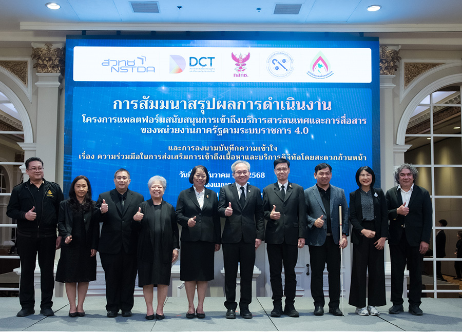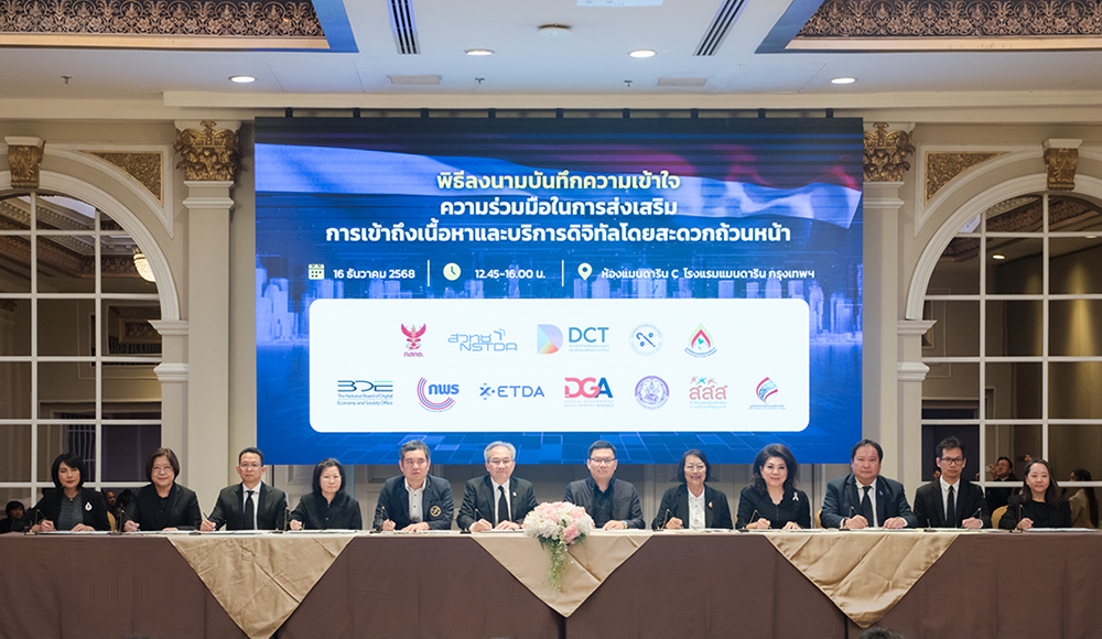 (เมื่อวันที่ 16 ธันวาคม 2568) ที่ห้องแมนดาริน C โรงแรมแมนดาริน กรุงเทพฯ: กระทรวงการอุดมศึกษา วิทยาศาสตร์ วิจัยและนวัตกรรม (อว.) โดยสำนักงานพัฒนาวิทยาศาสตร์และเทคโนโลยีแห่งชาติ (สวทช.) จัดพิธีลงนามบันทึกความเข้าใจในการส่งเสริมการเข้าถึงเนื้อหาและบริการดิจิทัลโดยสะดวกถ้วนหน้า ระหว่าง สวทช. สำนักงานคณะกรรมการกิจการกระจายเสียง กิจการโทรทัศน์ และกิจการโทรคมนาคมแห่งชาติ (กสทช.), สภาดิจิทัลเพื่อเศรษฐกิจและสังคมแห่งประเทศไทย, สมาคมคนตาบอดแห่งประเทศไทย, มูลนิธิสากลเพื่อคนพิการ, สำนักงานคณะกรรมการดิจิทัลเพื่อเศรษฐกิจและสังคมแห่งชาติ, สำนักงานคณะกรรมการพัฒนาระบบราชการ, สำนักงานพัฒนาธุรกรรมทางอิเล็กทรอนิกส์, สำนักงานพัฒนารัฐบาลดิจิทัล (องค์การมหาชน), กรมส่งเสริมและพัฒนาคุณภาพชีวิตคนพิการ, สำนักงานกองทุนสนับสนุนการสร้างเสริมสุขภาพ และมูลนิธิอินเทอร์เน็ตร่วมพัฒนาไทย