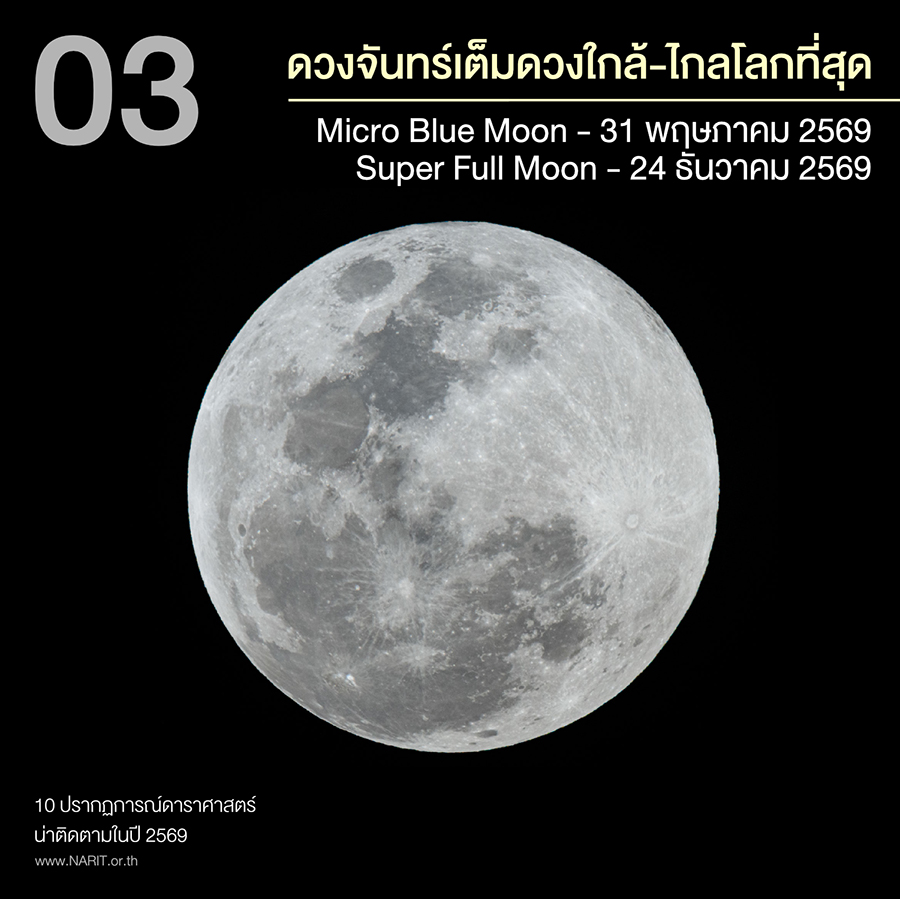 3. ดวงจันทร์เต็มดวงใกล้-ไกลโลกที่สุดในรอบปี ปรากฏการณ์ “ดวงจันทร์เต็มดวงไกลโลกที่สุดในรอบปี” (Micro Full Moon) จะตรงกับวันที่ 31 พฤษภาคม 2569 ซึ่งตรงกับวันวิสาขบูชา นอกจากนี้ยังเป็นดวงจันทร์เต็มดวง