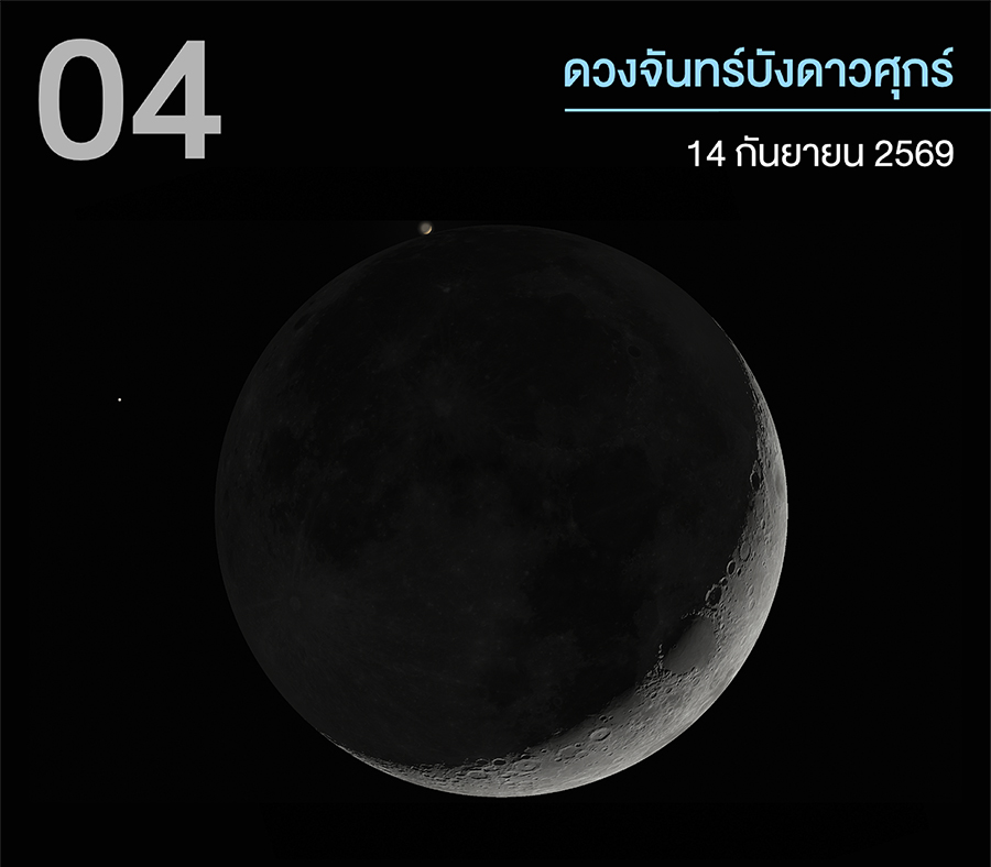 4. ดวงจันทร์บังดาวศุกร์ วันที่ 14 กันยายน 2569 เวลาประมาณ 19:28 – 20:34 น. (เวลา ณ กรุงเทพมหานคร) เริ่มสังเกตการณ์ได้ตั้งแต่ช่วงหัวค่ำ หลังดวงอาทิตย์ตกลับขอบฟ้า ทางทิศตะวันตก ในช่วงเวลาประมาณ 19:28 น.ดวงจันทร์จะค่อย ๆ เคลื่อนที่ไปบังดาวศุกร์ จนดาวศุกร์ลับหายไปหลังดวงจันทร์ฝั่งพื้นผิวส่วนมืด และโผล่พ้นออกมาทั้งดวงอีกครั้งฝั่งเสี้ยวสว่าง เวลาประมาณ 20:34 น. อย่างไรก็ตามในคืนดังกล่าว ดวงจันทร์จะตกลับขอบฟ้าเวลาประมาณ 20:24 น. ส่งผลให้ผู้สังเกตในประเทศไทยไม่สามารถสังเกตได้ครบทั้งปรากฏการณ์ แต่ยังคงสามารถติดตามชมช่วงสำคัญของการบังส่วนแรกได้ หากฟ้าใส ไร้เมฆฝน สังเกตเห็นได้ด้วยตาเปล่าทุกพื้นที่ทั่วประเทศไทย