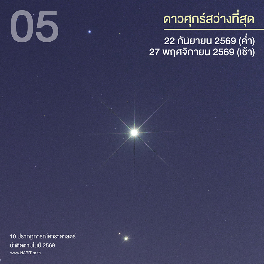 5. ดาวศุกร์สว่างที่สุด เกิดขึ้น 2 ครั้งในรอบปีนี้ ครั้งแรกวันที่ 22 กันยายน 2569 ช่วงหัวค่ำทางทิศตะวันตก และวันที่ 27 พฤศจิกายน 2569 ช่วงรุ่งเช้าทางทิศตะวันออก หากมองผ่านกล้องโทรทรรศน์จะเห็นดาวศุกร์ปรากฏเป็นเสี้ยวคล้ายดวงจันทร์