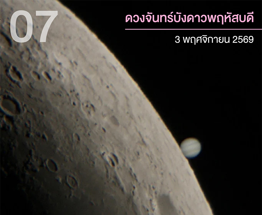 7. ดวงจันทร์บังดาวพฤหัสบดี เช้ามืดวันที่ 3 พฤศจิกายน 2569 จะเกิดปรากฏการณ์ “ดวงจันทร์บังดาวพฤหัสบดี” เมื่อมองจากโลกจะเห็นดวงจันทร์จะค่อย ๆ เคลื่อนมาบังดาวพฤหัสบดี จนดาวพฤหัสบดีลับหายไปหลังดวงจันทร์ฝั่งเสี้ยวสว่าง และโผล่พ้นออกมากทั้งดวงอีกครั้งฝั่งพื้นที่ผิวส่วนมืด เวลาประมาณ 05:23 น.(เวลา ณ จังหวัดสงขลา) ในไทยสังเกตเห็นได้ด้วยตาเปล่า เฉพาะภาคใต้ และบางเกาะในจังหวัดตราด สำหรับพื้นที่อื่นจะเห็นเป็นปรากฏการณ์ดาวพฤหัสบดีเคียงดวงจันทร์ตลอดคืน