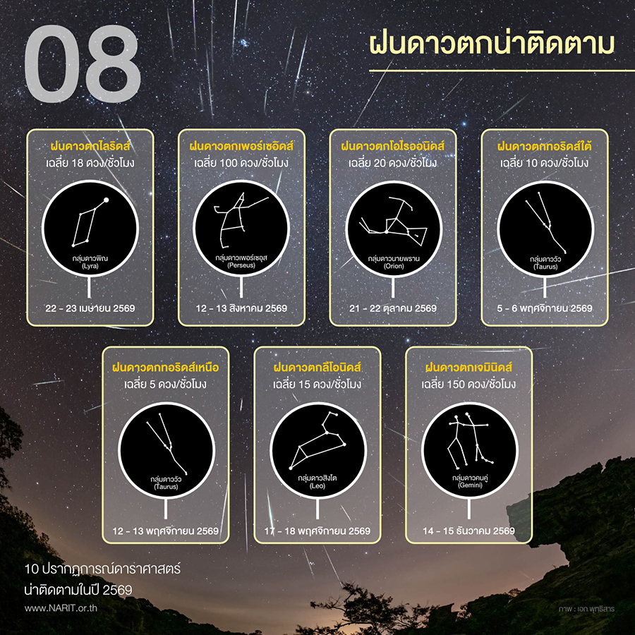 - 14 – 15 ธันวาคม 2569 ฝนดาวตกเจมินิดส์ (อัตราการตกสูงสุด 150 ดวงต่อชั่วโมง)
