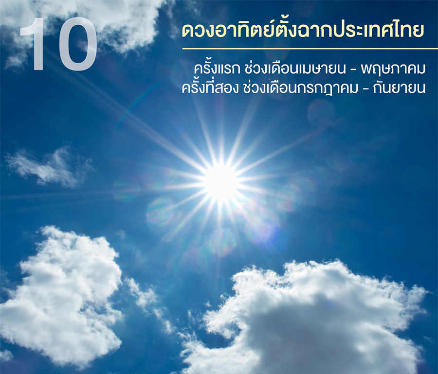 10. ดวงอาทิตย์ตั้งฉากประเทศไทย ประเทศไทยมีช่วงที่ดวงอาทิตย์ผ่านจุดเหนือศีรษะ 2 ครั้งในรอบปีครั้งแรกในช่วงเดือนเมษายน – พฤษภาคม เริ่มจากภาคใต้ไล่ขึ้นไปเรื่อย ๆ ถึงกรุงเทพฯ ตรงกับวันที่ 27 เมษายน 2569 และจบที่ภาคเหนือในเดือนพฤษภาคม ส่วนครั้งที่สองอยู่ในช่วงเดือนกรกฎาคม – กันยายน โดยเริ่มจากภาคเหนือปลายเดือนกรกฎาคม ไล่ลงไปจนถึงกรุงเทพฯ ตรงกับวันที่ 16 สิงหาคม 2569 และจบที่ภาคใต้ในช่วงเดือนกันยายน ช่วงเวลาที่ดวงอาทิตย์ผ่านจุดเหนือศีรษะ (ตั้งฉากกับประเทศไทย) จะแตกต่างกันไปแต่ละพื้นที่ สังเกตได้จากเงาจะตกอยู่ใต้วัตถุพอดีเสมือนไร้เงา
