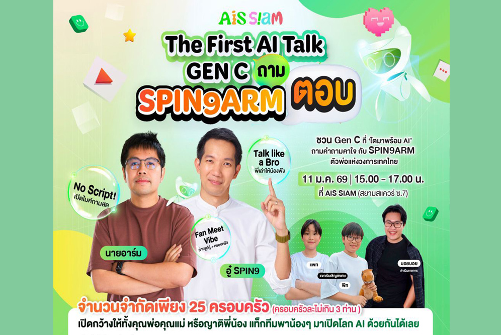 AIS SIAM เปิดเวทีชวนเด็ก Gen C (Creative Generation) และครอบครัวตั้งคำถามกับโลกอนาคตในงาน “The First AI Talk: Gen C ถาม SPIN9ARM ตอบ” เวทีทอล์กด้าน AI ครั้งแรกที่ดึง 2 ตัวพ่อไอทีแถวหน้าของไทย “อู๋ Spin9” และ “นายอาร์ม (9arm)” มานั่งทอล์คด้วยกันแบบสด ๆ ชนมุมคิดกันบนเวทีเดียว ที่ไม่ใช่การสอนใช้เทคโนโลยี แต่คือการชวนมองว่า “ในวันที่ AI ทำได้แทบทุกอย่าง เราควรคิดและใช้ AI อย่างไรให้เป็นพลังสร้างสรรค์”