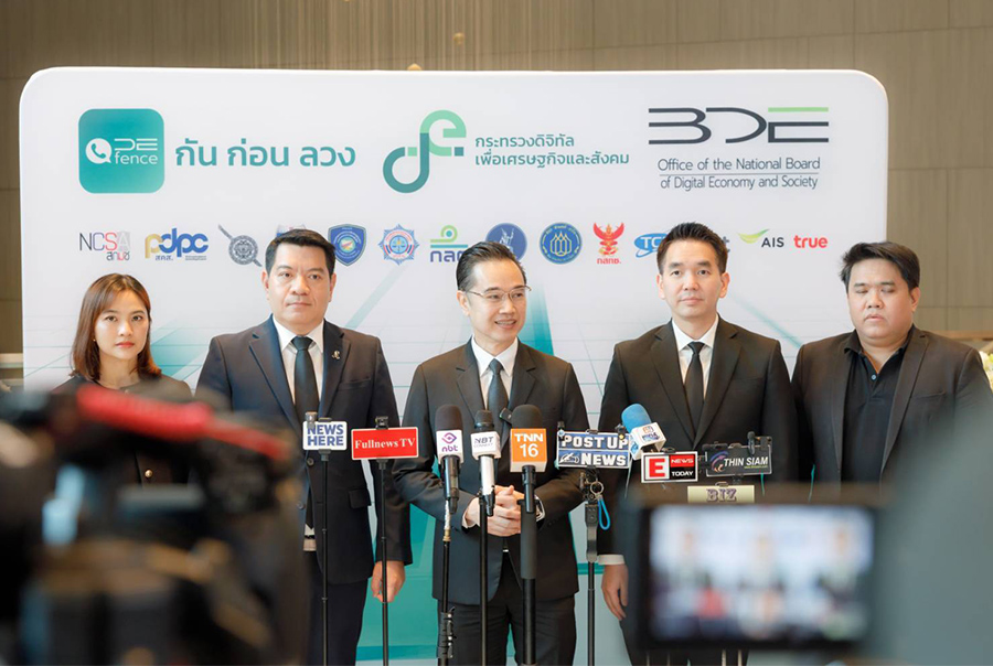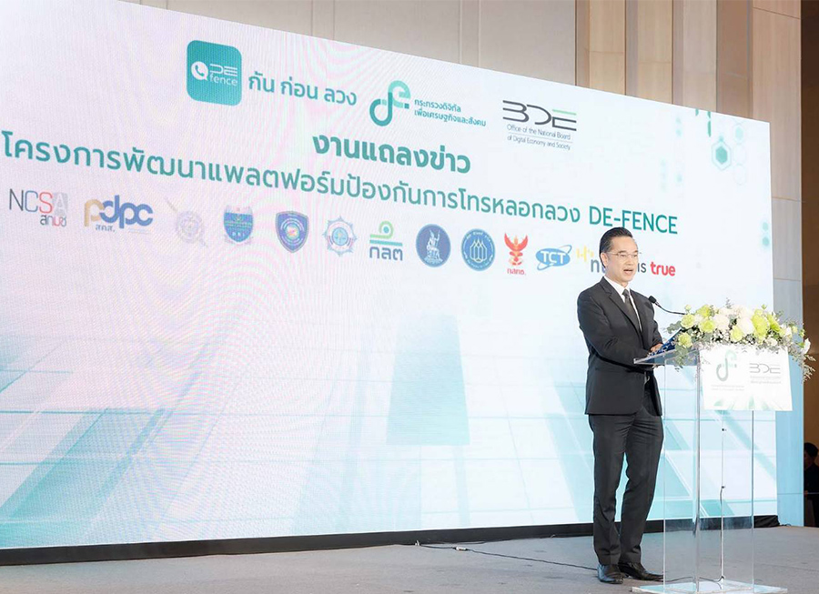 วันนี้ (15 มกราคม 2569) นายเวทางค์ พ่วงทรัพย์ เลขาธิการคณะกรรมการดิจิทัลเพื่อเศรษฐกิจและสังคมแห่งชาติ (BDE) และโฆษกกระทรวงดิจิทัลเพื่อเศรษฐกิจและสังคม (DE) ฝ่ายข้าราชการประจำ เป็นประธานงานแถลงข่าว “เปิดตัวแอปพลิเคชันป้องกันการโทรหลอกลวง” (DE-FENCE) ภายใต้โครงการพัฒนาแพลตฟอร์มป้องกันการโทรหลอกลวง โดยสำนักงานปลัดกระทรวงดิจิทัลเพื่อเศรษฐกิจและสังคม และสำนักงานคณะกรรมการดิจิทัลเพื่อเศรษฐกิจและสังคมแห่งชาติ บูรณาการความร่วมมือจากหน่วยงานที่เกี่ยวข้อง ประกอบด้วย สำนักงานตำรวจแห่งชาติ สำนักงานคณะกรรมการกิจการกระจายเสียง กิจการโทรทัศน์ และกิจการโทรคมนาคมแห่งชาติ (กสทช.) สมาคมโทรคมนาคมแห่งประเทศไทยในพระบรมราชูปถัมภ์ ธนาคารแห่งประเทศไทย สมาคมธนาคารไทยสำนักงานคณะกรรมการป้องกันและปราบปรามการฟอกเงิน สำนักงานคณะกรรมการกำกับหลักทรัพย์และตลาดหลักทรัพย์กรมสอบสวนคดีพิเศษ กองบัญชาการตำรวจสืบสวนสอบสวนอาชญากรรมทางเทคโนโลยี สำนักงานคณะกรรมการการรักษาความมั่นคงปลอดภัยไซเบอร์แห่งชาติ (สกมช.) สำนักงานคณะกรรมการคุ้มครองข้อมูลส่วนบุคคล (สคส.) บริษัท โทรคมนาคมแห่งชาติ จำกัด (มหาชน) บริษัท แอดวานซ์ ไวร์เลส เน็ทเวอร์ค จำกัด และบริษัท ทรู มูฟ เอช ยูนิเวอร์แซล คอมมิวนิเคชั่น จำกัด จัดขึ้น ณ โรงแรมอัศวิน แกรนด์ คอนเวนชั่น กรุงเทพฯ