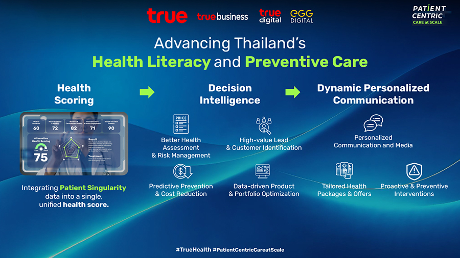 “เป้าหมายของทรู ไม่ใช่เพียงแค่การรวบรวมข้อมูลแล้วนำมาวิเคราะห์ แต่คือการสร้างระบบที่มีผู้ป่วยและผู้ที่ยังไม่ป่วยเป็นศูนย์กลาง เพื่อรู้จักและเข้าใจผู้คนแต่ละคนได้แบบเฉพาะเจาะจง เพื่อช่วยให้แพทย์ตัดสินใจได้แม่นยำขึ้น (Precision Medicine) และเปลี่ยนระบบการดูแลสุขภาพจากการรักษาเมื่อเจ็บป่วย ให้กลายเป็นการดูแลสุขภาพเชิงรุก ป้องกันก่อนเกิดโรค (Proactive Health Prevention) และทำให้คนไทยมี Health Literacy รู้จักและดูแลสุขภาพตนเอง ปรับพฤติกรรมเพื่อสุขภาพที่ดีขึ้นได้ทุกๆวัน ซึ่งจะเป็นจุดเริ่มต้นในการช่วยดูแลสุขภาพคนไทย ควบคู่กับการช่วยลดภาระแพทย์และบุคลากรทางการแพทย์ รวมถึงยกระดับระบบสาธารณสุข “เชิงรุก” ให้เกิดขึ้นได้จริงในประเทศไทย” ดร.ธีรเดช กล่าวทิ้งท้าย