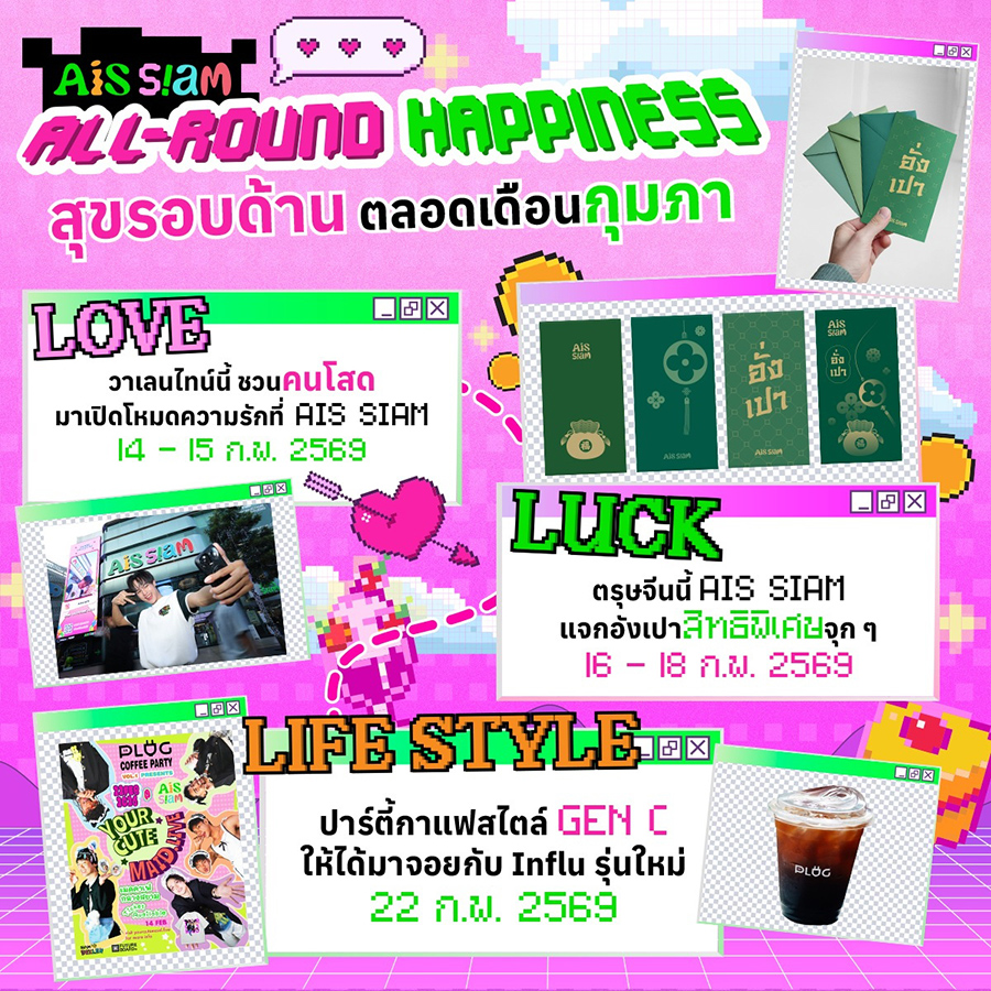 AIS SIAM คอมมูนิตี้สเปซเจนซีใจกลางสยาม พื้นที่ของคนชอบเล่น จนได้เป็นตัวจริงต้อนรับความสุขตลอดเดือนกุมภาพันธ์นี้ พร้อมวัยรุ่น Gen-C (Creative Generation) เตรียมพลังความครีเอทีฟแล้วออกมาปักหมุดที่ AIS SIAM จุดนัดพบใจกลางสยามที่รวมทุกไลฟ์สไตล์ไว้ในที่เดียว ให้ทุกคนมาสร้างโมเมนต์ใหม่ๆ ที่แชร์ได้จริง คอนเทนต์ปังได้ทุกมุม ไม่ว่าจะสายรัก สายมู หรือสายปาร์ตี้ เพราะเดือนนี้ AIS SIAM มีให้ครบแบบจัดเต็มกับ 3 ไฮไลท์กิจกรรมใหญ่ตลอดเดือน ทั้ง LOVE เทศกาลวาเลนไทน์, LUCK เทศกาลตรุษจีน, และ LIFESTYLE ปาร์ตี้กาแฟรูปแบบใหม่กับ 5 อินฟลูเอนเซอร์รุ่นใหม่ชื่อดัง โดยเริ่มที่ LOVE เทศกาลแห่งความรัก วันวาเลนไทน์ ในวันที่ 14 – 15 ก.พ. 2569